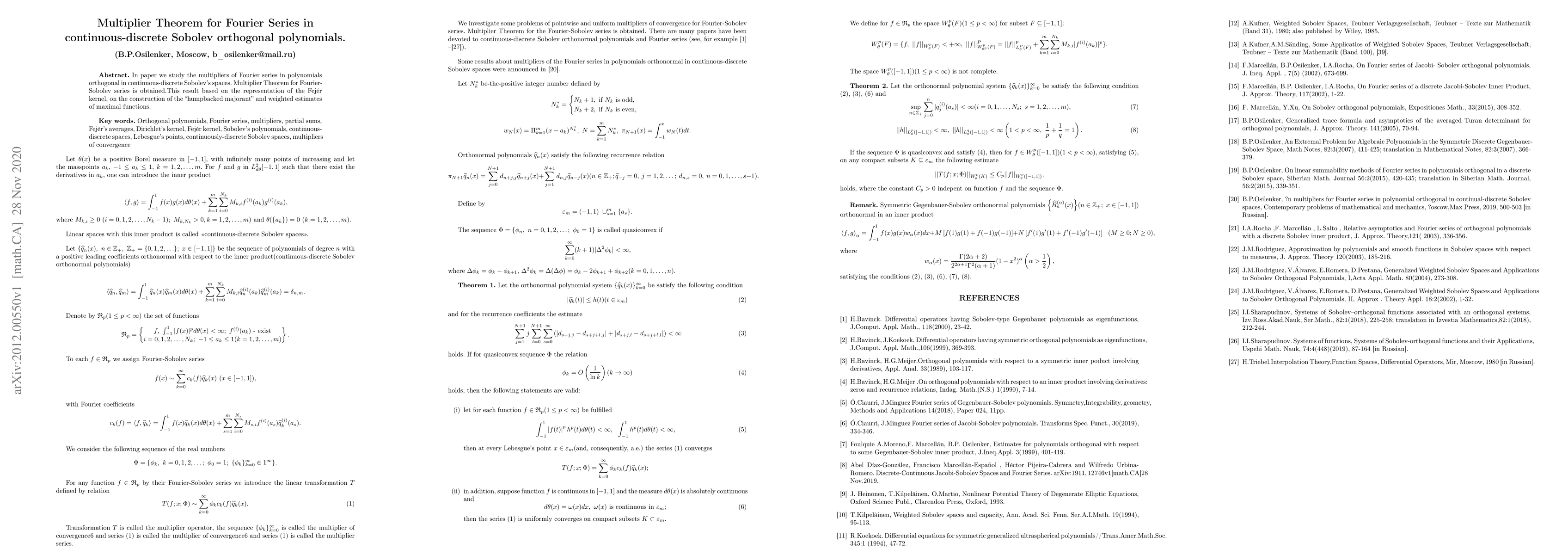 In the paper we study the multipliers of Fourier series in polynomials orthogonal in continuous-discrete Sobolev's spaces. Multiplier Theorem for Fourier-Sobolev series is obtained. This result is based on the representation of the Fej\'er kernel, on the construction of the "humpbacked majorant" and weighted estimates of maximal functions.