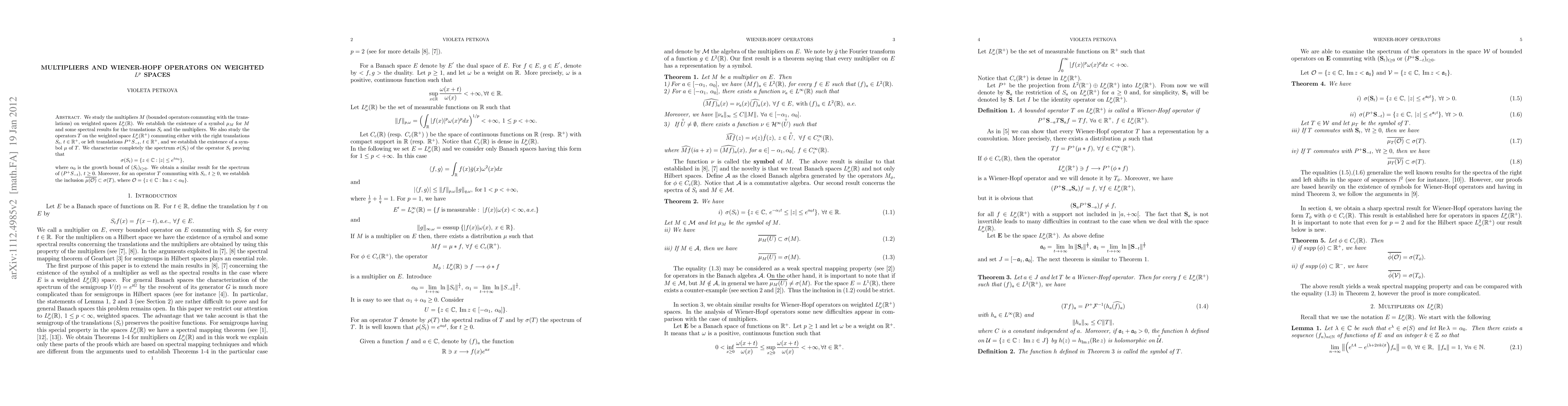 We study the operators T on the weighted space L^p commuting either with the right translations St or left translations P^+S_{-t} and we establish the existence of a symbol of T. We characterize completely the spectrum of St. We obtain a similar result for the spectrum of P^+S_{-t} and some spectral results for the bounded operators commuting with (St), t>0 or with (P^+St), t<0.