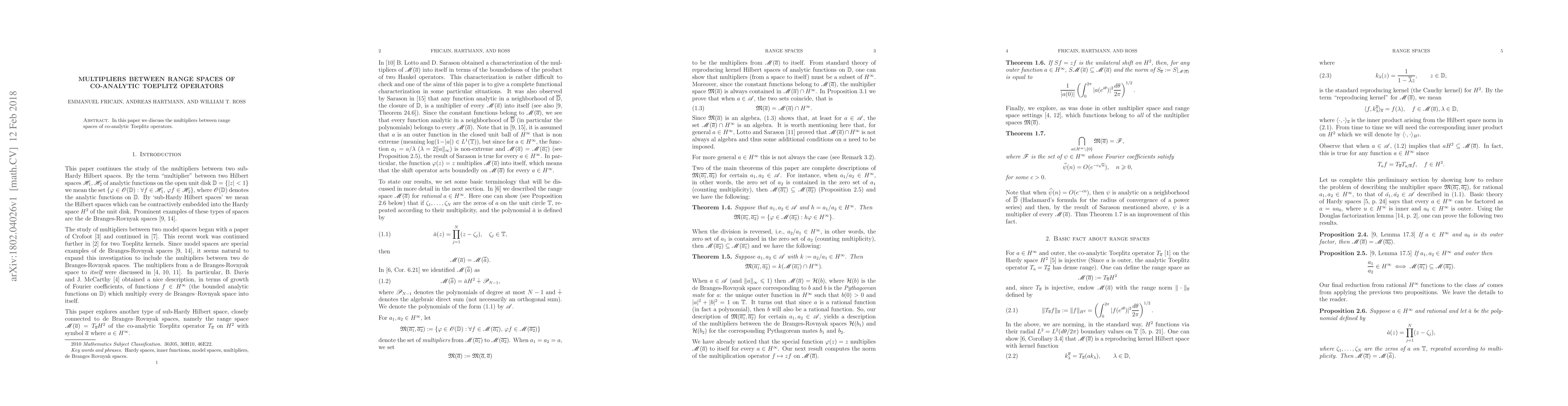 Summary: This paper investigates the multipliers between the range spaces of co-analytic Toeplitz operators, exploring their properties and implications within functional analysis.