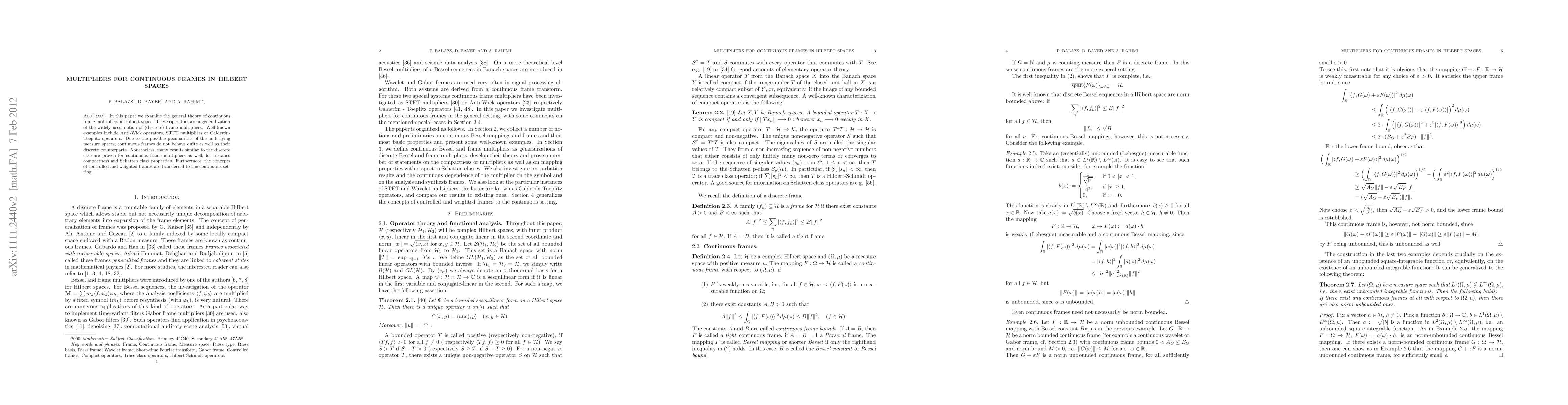 This paper explores the theory of continuous frame multipliers in Hilbert spaces, generalizing discrete frame multipliers. It establishes properties such as compactness and Schatten class membership, and extends concepts like controlled and weighted frames to the continuous setting.