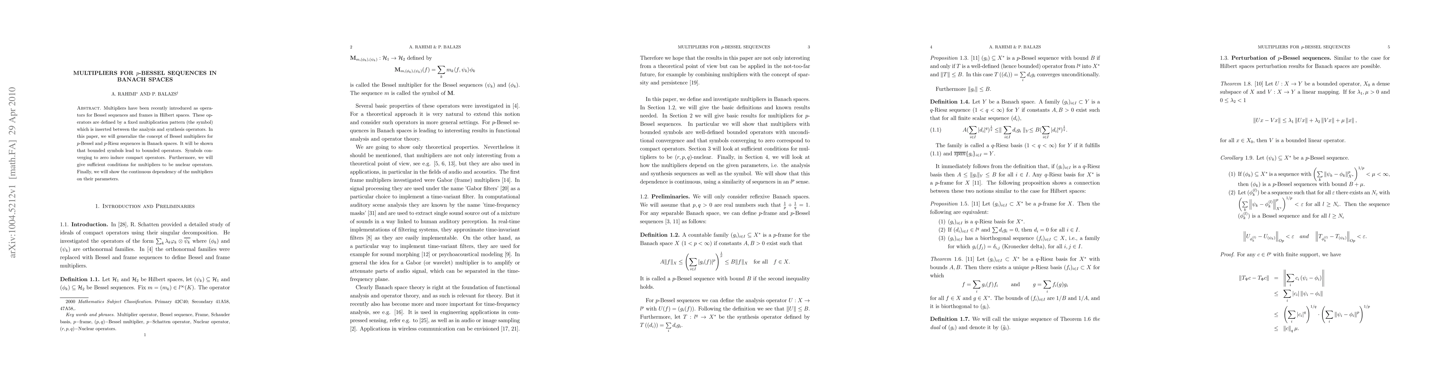 Multipliers have been recently introduced as operators for Bessel sequences and frames in Hilbert spaces. These operators are defined by a fixed multiplication pattern (the symbol) which is inserted between the analysis and synthesis operators. In this paper, we will generalize the concept of Bessel multipliers for p-Bessel and p-Riesz sequences in Banach spaces. It will be shown that bounded symbols lead to bounded operators. Symbols converging to zero induce compact operators. Furthermore, we will give sufficient conditions for multipliers to be nuclear operators. Finally, we will show the continuous dependency of the multipliers on their parameters.