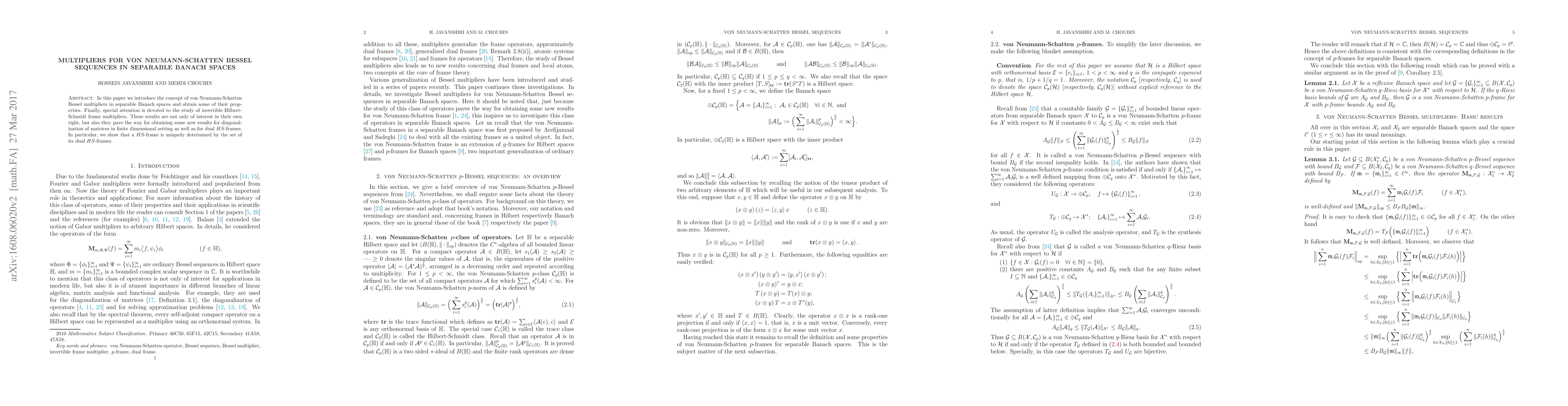 In this paper we introduce the concept of von Neumann-Schatten Bessel multipliers and obtain some of their characterizations. Finally, special attention is devoted to the study of invertible Hilbert--Schmidt frame multipliers. These results are not only of interest in their own right, but also they pave the way for obtaining some new results for diagonalization of matrices in finite dimensional setting as well as for dual $g$-frames. In particular, we show that a $g$-frame is uniquely determined by the set of its $g$-frames.
