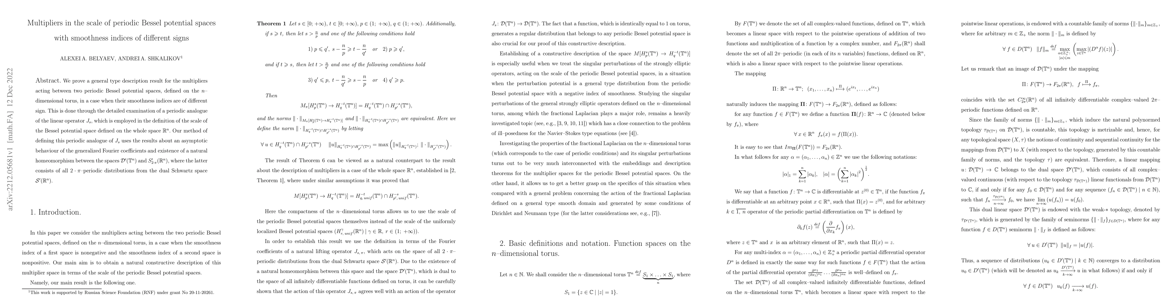We prove a general type description result for the multipliers acting between two periodic Bessel potential spaces, defined on the $n$--dimensional torus, in a case when their smoothness indices are of different signs. This is done through the detailed examination of a periodic analogue of the linear operator $J_s$, which is employed in the definition of the scale of the Bessel potential space defined on the whole space $\mathbb{R}^n$. Our method of defining this periodic analogue of $J_s$ uses the results about an asymptotic behaviour of the generalized Fourier coefficients and existence of a natural homeomorphism between the spaces $\mathcal{D}'(\mathbb{T}^n)$ and $S'_{2 \cdot \pi}(\mathbb{R}^n)$, where the latter consists of all $2 \cdot \pi$--periodic distributions from the dual Schwartz space $\mathcal{S}'(\mathbb{R}^n)$.