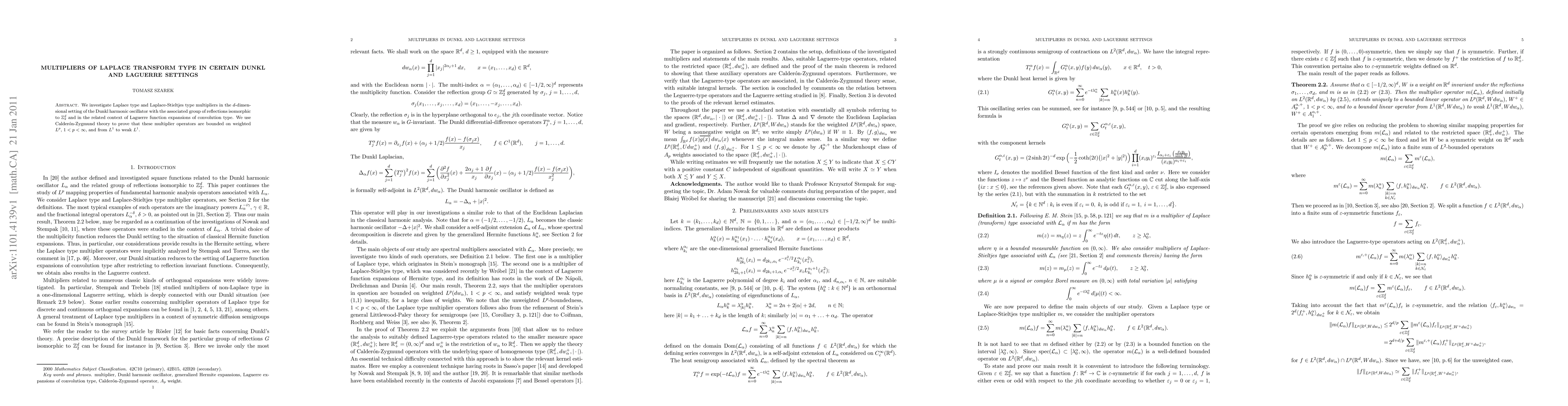 This paper explores Laplace and Laplace-Stieltjes multipliers in the Dunkl setting and Laguerre function expansions, proving their boundedness on weighted $L^p$ spaces using Calderón-Zygmund theory. The study is conducted within the $d$-dimensional Dunkl harmonic oscillator framework and related convolution contexts.