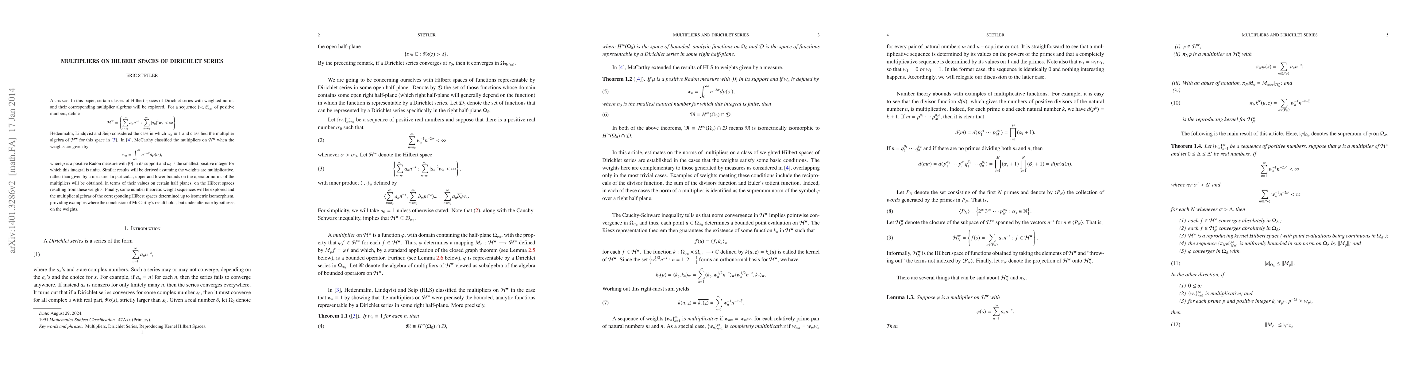 This paper explores multiplier algebras on Hilbert spaces of Dirichlet series defined by weighted norms, focusing on multiplicative weight sequences. It derives upper and lower bounds for the operator norms of multipliers in terms of their values on specific half planes, and determines the multiplier algebras for number-theoretic weight sequences, extending previous results by Hedenmalm, Lindqvist, Seip, and McCarthy.