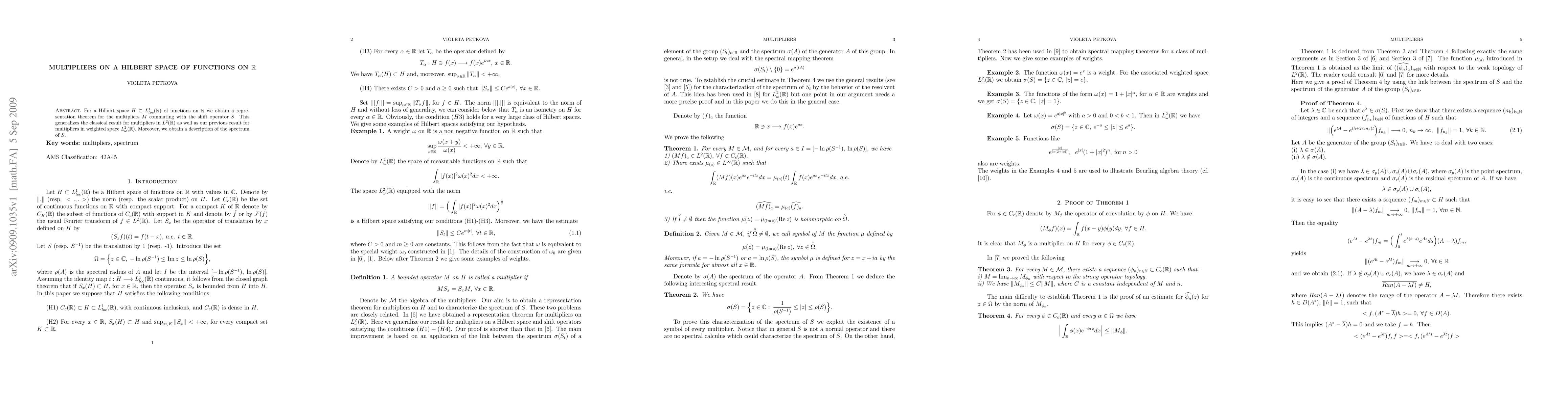 Researchers develop a representation theorem for multipliers on Hilbert spaces of functions on R, generalizing classical results to L^1_{loc} (R) space, and providing insight into the spectrum of the shift operator S.