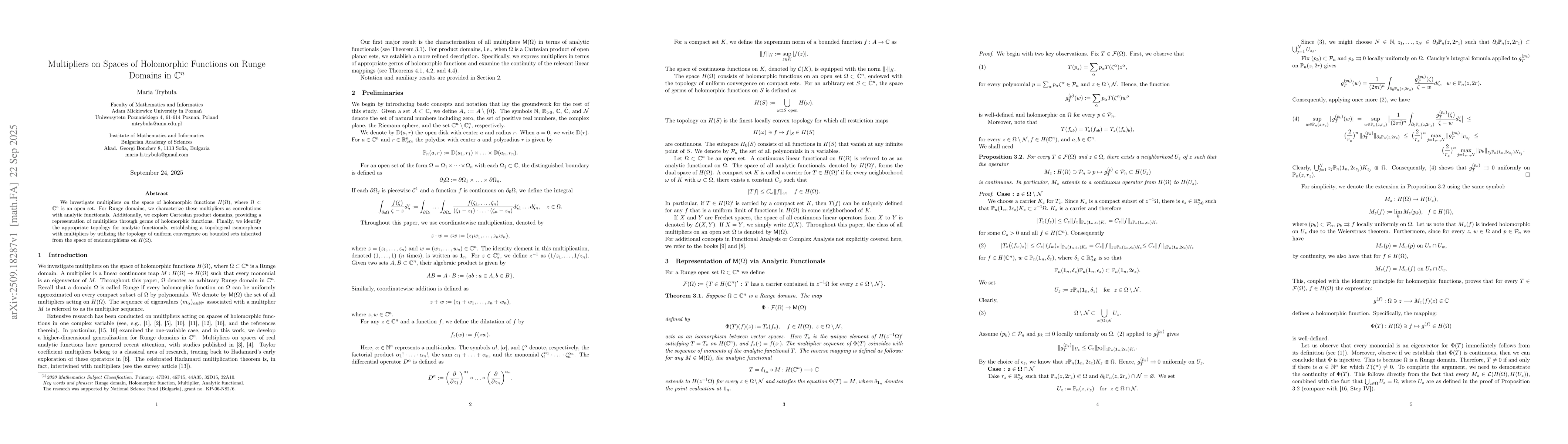 The authors study multipliers on the space of holomorphic functions on Runge domains, using convolution with analytic functionals, Köthe–Grothendieck–Tillmann duality, and germ representations on Cartesian product domains, and establish a topological isomorphism via uniform convergence on bounded sets.