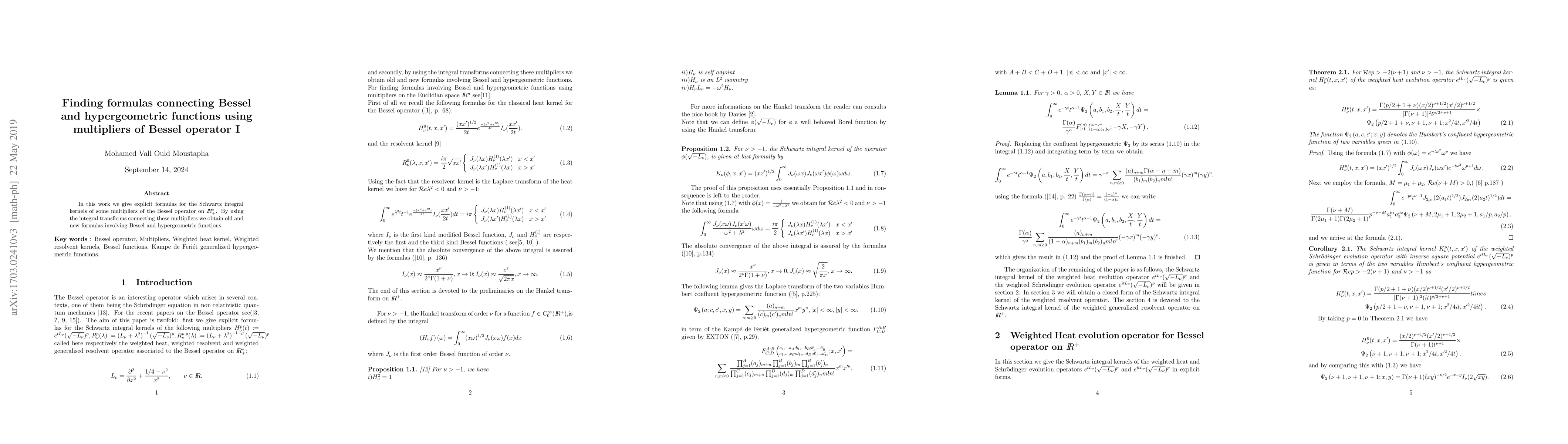 In this work we give explicit formulas for the Schwartz integral kernels of some multipliers of the Schr\"odinger operator with inverse square potential on $\R^\ast_+$. By using the integral transforms connecting these multipliers we obtain old and new formulas involving Bessel and hypergeometric functions