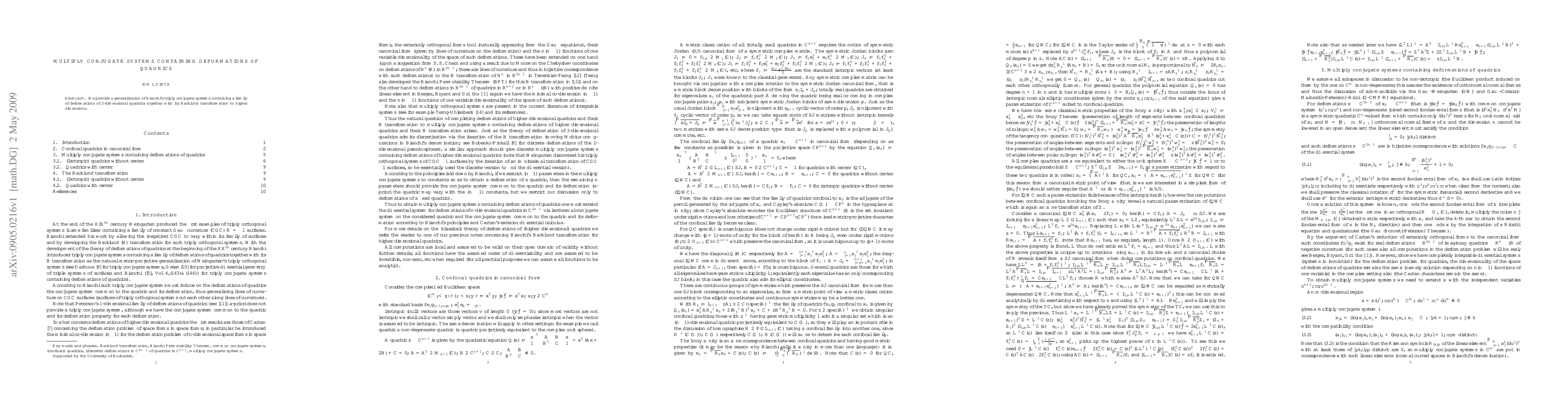 Summary: This paper generalizes Bianchi's triply conjugate systems to higher dimensions, incorporating deformations of 2-dimensional quadrics and presenting their associated Bäcklund transformations. The focus is on extending these concepts to multidimensional frameworks.