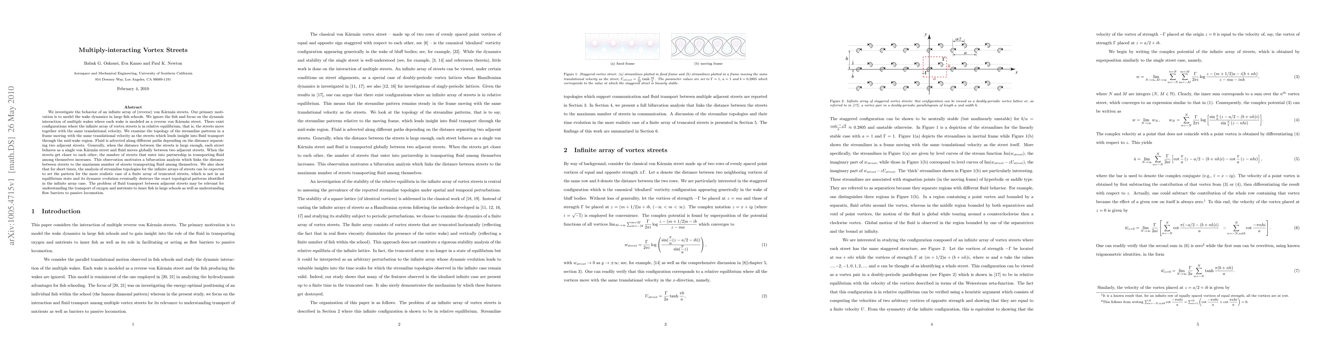 Researchers study the behavior of an infinite array of vortex streets in fish schools, finding that fluid transport varies depending on distance between streets, with a maximum number of partner streets identified through bifurcation analysis.
