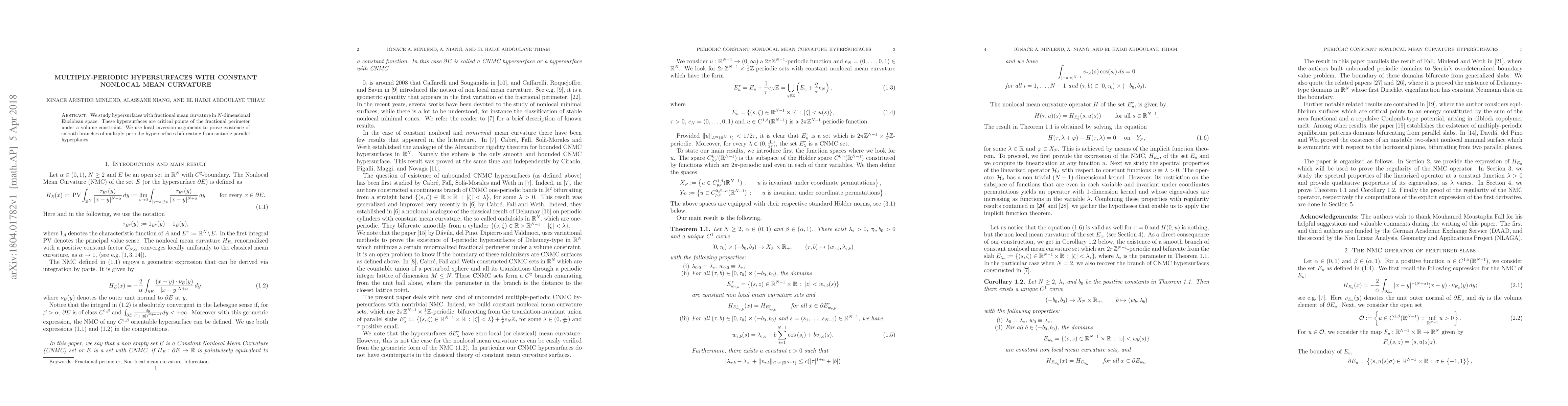 We study hypersurfaces with fractional mean curvature in N-dimensional Euclidean space. These hypersurfaces are critical points of the fractional perimeter under a volume constraint. We use local inversion arguments to prove existence of smooth branches of multiply-periodic hypersurfaces bifurcating from suitable parallel hyperplanes.