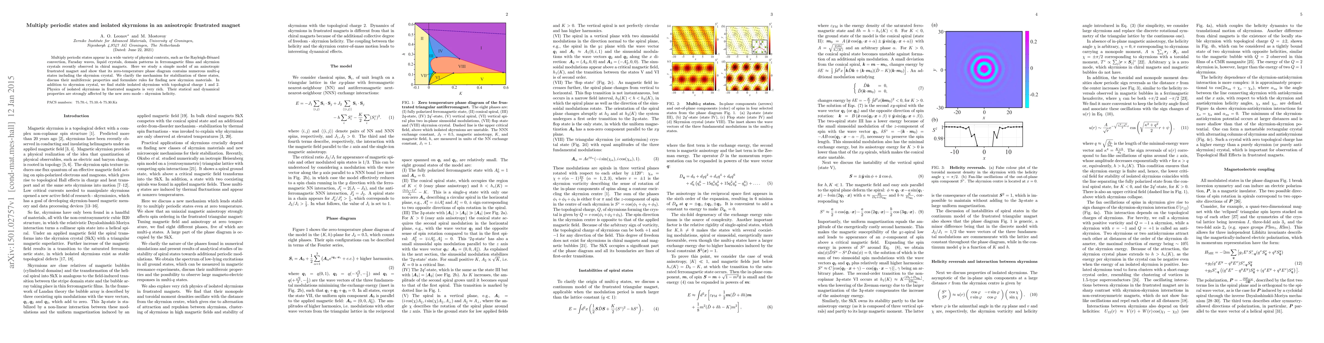 Multiply periodic states appear in a wide variety of physical contexts, such as the Rayleigh-Benard convection, Faraday waves, liquid crystals, domain patterns in ferromagnetic films and skyrmion crystals recently observed in chiral magnets. Here we study a simple model of an anisotropic frustrated magnet and show that its zero-temperature phase diagram contains numerous multi-q states including the skyrmion crystal. We clarify the mechanism for stabilization of these states, discuss their multiferroic properties and formulate rules for finding new skyrmion materials. In addition to skyrmion crystal, we find stable isolated skyrmions with topological charge 1 and 2. Physics of isolated skyrmions in frustrated magnets is very rich. Their statical and dynamical properties are strongly affected by the new zero mode - skyrmion helicity.