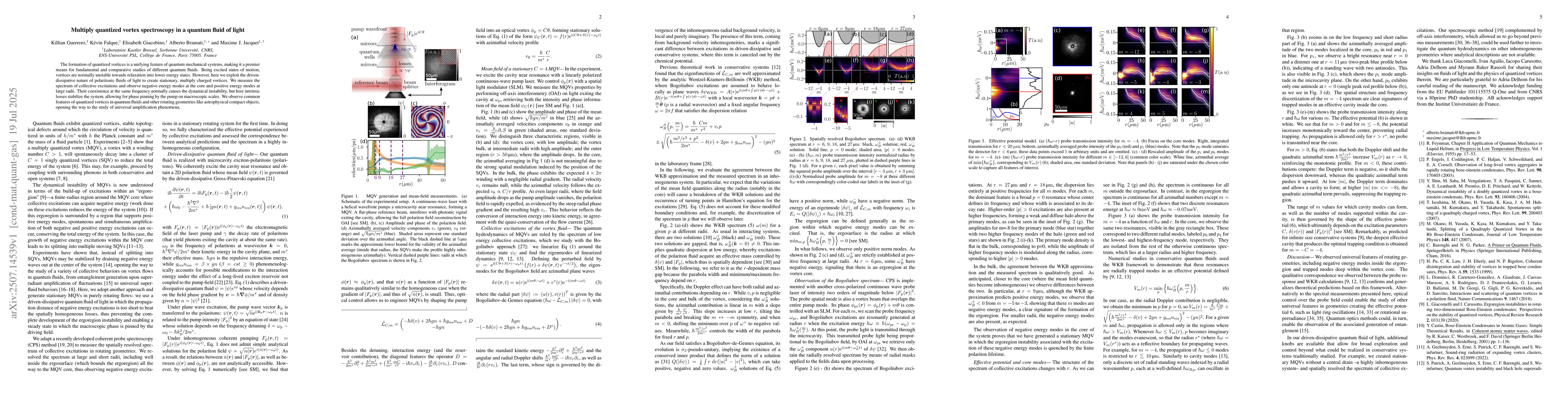 The formation of quantized vortices is a unifying feature of quantum mechanical systems, making it a premier means for fundamental and comparative studies of different quantum fluids. Being excited states of motion, vortices are normally unstable towards relaxation into lower energy states. However, here we exploit the driven-dissipative nature of polaritonic fluids of light to create stationary, multiply charged vortices. We measure the spectrum of collective excitations and observe negative energy modes at the core and positive energy modes at large radii. Their coexistence at the same frequency normally causes the dynamical instability, but here intrinsic losses stabilize the system, allowing for phase pinning by the pump on macroscopic scales. We observe common features of quantized vortices in quantum fluids and other rotating geometries like astrophysical compact objects, opening the way to the study of universal amplification phenomena.