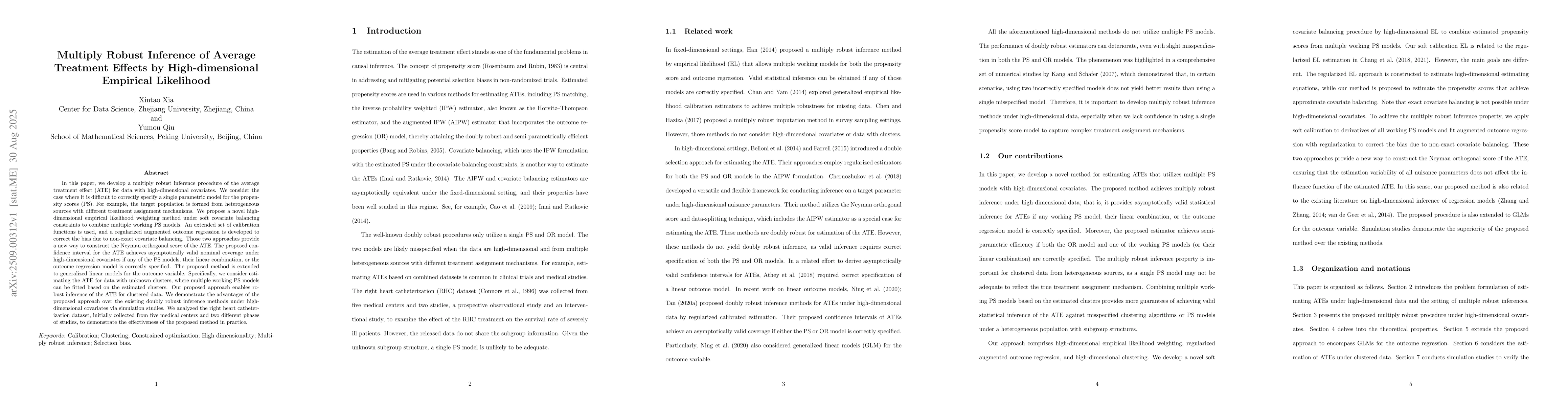 In this paper, we develop a multiply robust inference procedure of the average treatment effect (ATE) for data with high-dimensional covariates. We consider the case where it is difficult to correctly specify a single parametric model for the propensity scores (PS). For example, the target population is formed from heterogeneous sources with different treatment assignment mechanisms. We propose a novel high-dimensional empirical likelihood weighting method under soft covariate balancing constraints to combine multiple working PS models. An extended set of calibration functions is used, and a regularized augmented outcome regression is developed to correct the bias due to non-exact covariate balancing. Those two approaches provide a new way to construct the Neyman orthogonal score of the ATE. The proposed confidence interval for the ATE achieves asymptotically valid nominal coverage under high-dimensional covariates if any of the PS models, their linear combination, or the outcome regression model is correctly specified. The proposed method is extended to generalized linear models for the outcome variable. Specifically, we consider estimating the ATE for data with unknown clusters, where multiple working PS models can be fitted based on the estimated clusters. Our proposed approach enables robust inference of the ATE for clustered data. We demonstrate the advantages of the proposed approach over the existing doubly robust inference methods under high-dimensional covariates via simulation studies. We analyzed the right heart catheterization dataset, initially collected from five medical centers and two different phases of studies, to demonstrate the effectiveness of the proposed method in practice.