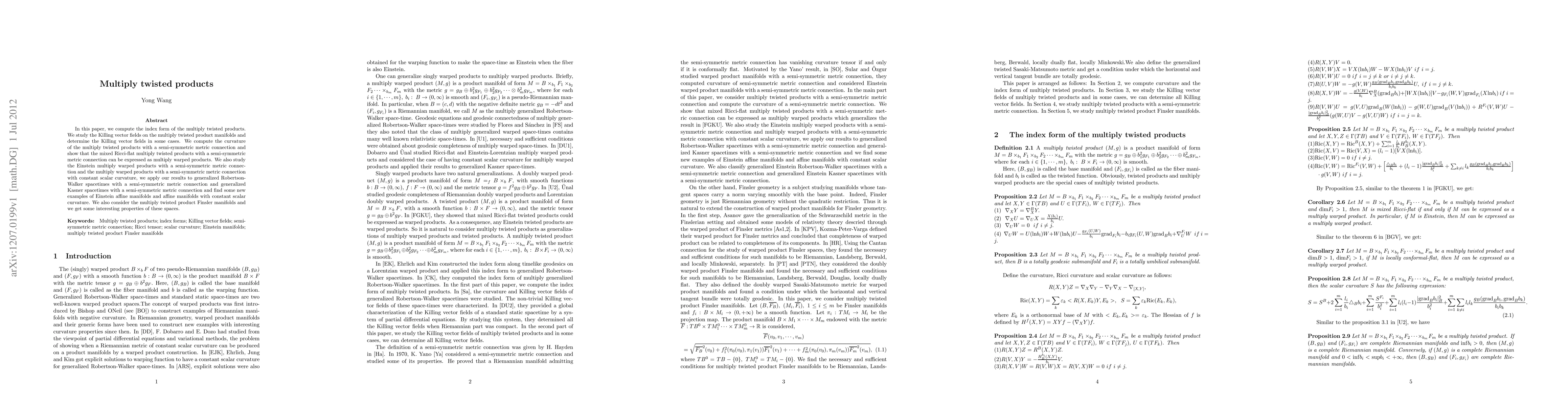 This paper investigates the index form and Killing vector fields of multiply twisted product manifolds, computes their curvature with a semi-symmetric metric connection, and explores Einstein and constant scalar curvature multiply warped products, applying results to generalized Robertson-Walker and Kasner spacetimes, and studying multiply twisted product Finsler manifolds.