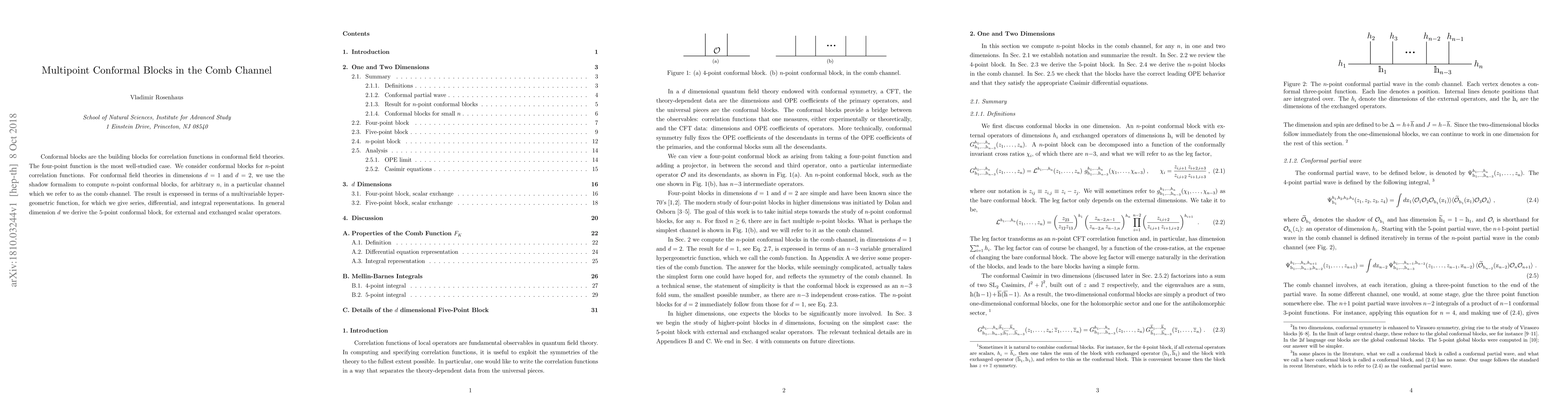 Conformal blocks are the building blocks for correlation functions in conformal field theories. The four-point function is the most well-studied case. We consider conformal blocks for $n$-point correlation functions. For conformal field theories in dimensions $d=1$ and $d=2$, we use the shadow formalism to compute $n$-point conformal blocks, for arbitrary $n$, in a particular channel which we refer to as the comb channel. The result is expressed in terms of a multivariable hypergeometric function, for which we give series, differential, and integral representations. In general dimension $d$ we derive the $5$-point conformal block, for external and exchanged scalar operators.