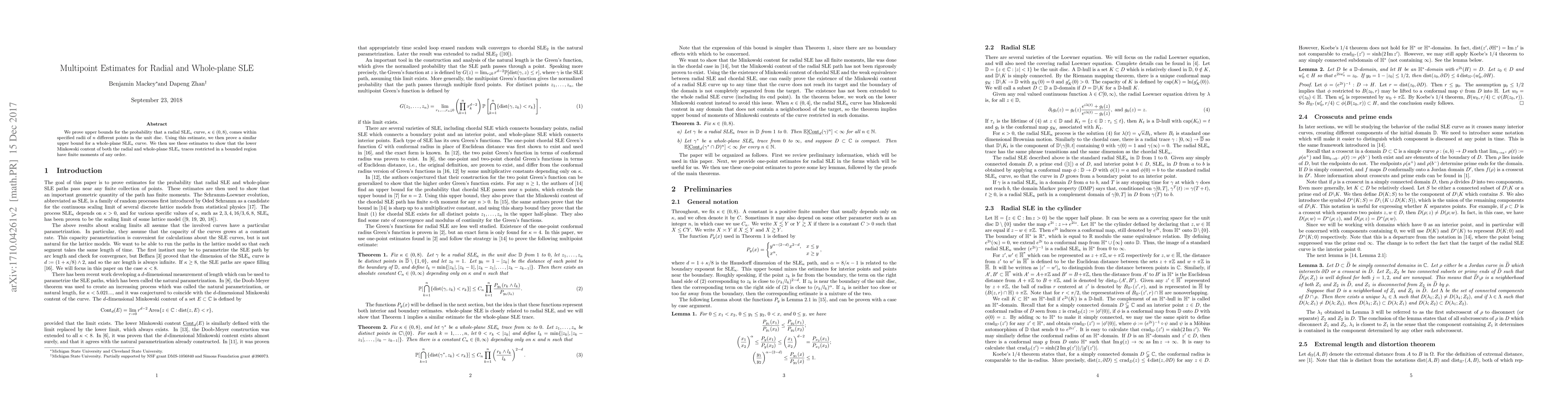 We prove upper bounds for the probability that a radial SLE$_{\kappa}$ curve, $\kappa\in(0,8)$, comes within specified radii of $n$ different points in the unit disc. Using this estimate, we then prove a similar upper bound for a whole-plane SLE$_{\kappa}$ curve. We then use these estimates to show that the lower Minkowski content of both the radial and whole-plane SLE$_{\kappa}$ traces restricted in a bounded region have finite moments of any order.