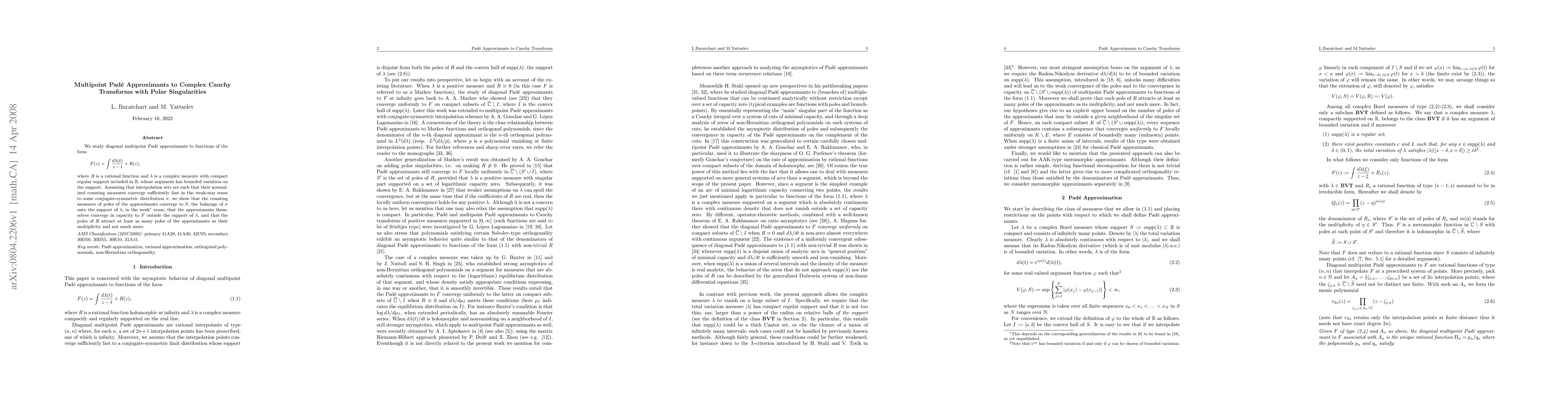This paper investigates the convergence properties of diagonal multipoint Padé approximants for sums involving complex Cauchy transforms and rational functions. It demonstrates that under certain convergence conditions of interpolation sets, the approximants converge to the original function and their poles align with the balayage of a conjugate-symmetric distribution.