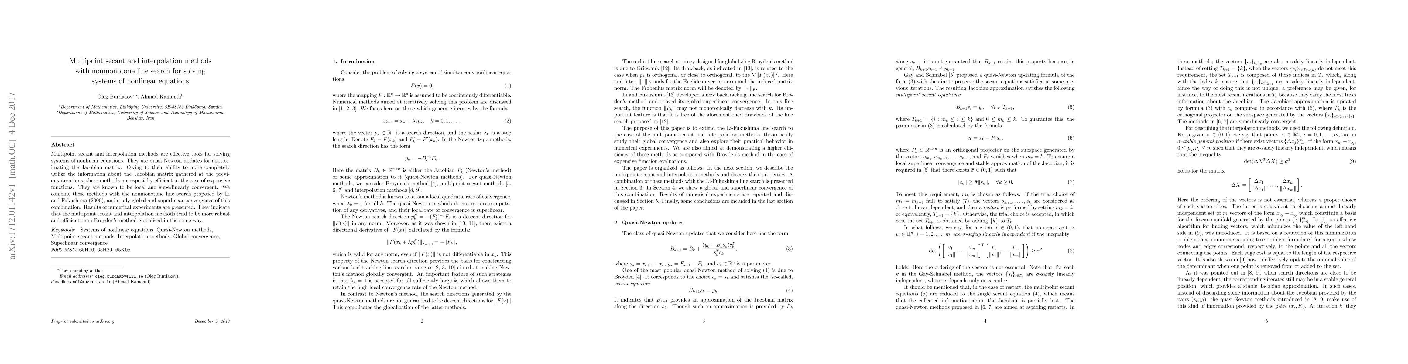 This paper combines multipoint secant and interpolation methods with a nonmonotone line search to solve systems of nonlinear equations, showing global and superlinear convergence and improved robustness over Broyden's method.