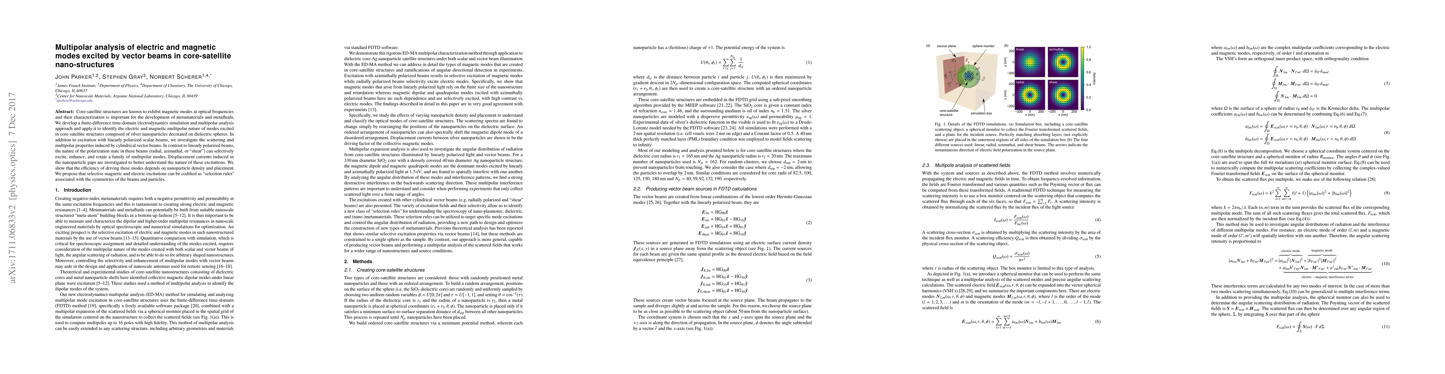 Core-satellite structures are known to exhibit magnetic modes at optical frequencies and their characterization is important for the development of metamaterials and metafluids. We develop a finite-difference time-domain electrodynamics simulation and multipolar analysis approach and apply it to identify the electric and magnetic multipolar nature of modes excited in core-satellite structures composed of silver nanoparticles decorated on dielectric spheres. In addition to excitation with linearly polarized scalar beams, we investigate the scattering and multipolar properties induced by cylindrical vector beams. In contrast to linearly polarized beams, the nature of the polarization state in these beams (radial, azimuthal, or "shear") can selectively excite, enhance, and rotate a family of multipolar modes. Displacement currents induced in the nanoparticle gaps are investigated to better understand the nature of these excitations. We show that the efficiency of driving these modes depends on nanoparticle density and placement. We propose that selective magnetic and electric excitations can be codified as "selection rules" associated with the symmetries of the beams and particles.