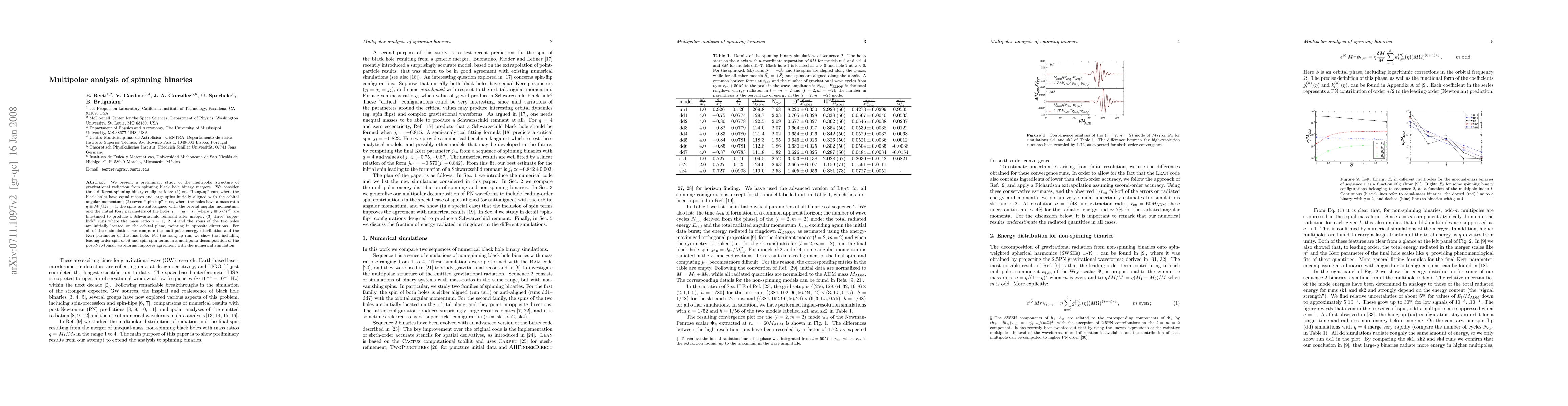 We present a preliminary study of the multipolar structure of gravitational radiation from spinning black hole binary mergers. We consider three different spinning binary configurations: (1) one "hang-up" run, where the black holes have equal masses and large spins initially aligned with the orbital angular momentum; (2) seven "spin-flip" runs, where the holes have a mass ratio q=4, the spins are anti-aligned with the orbital angular momentum, and the initial Kerr parameters of the holes j_1=j_2=j_i are fine-tuned to produce a Schwarzschild remnant after merger; (3) three "super-kick" runs where the mass ratio q=M_1/M_2=1, 2, 4 and the spins of the two holes are initially located on the orbital plane, pointing in opposite directions. For all of these simulations we compute the multipolar energy distribution and the Kerr parameter of the final hole. For the hang-up run, we show that including leading-order spin-orbit and spin-spin terms in a multipolar decomposition of the post-Newtonian waveforms improves the agreement with the numerical simulation.