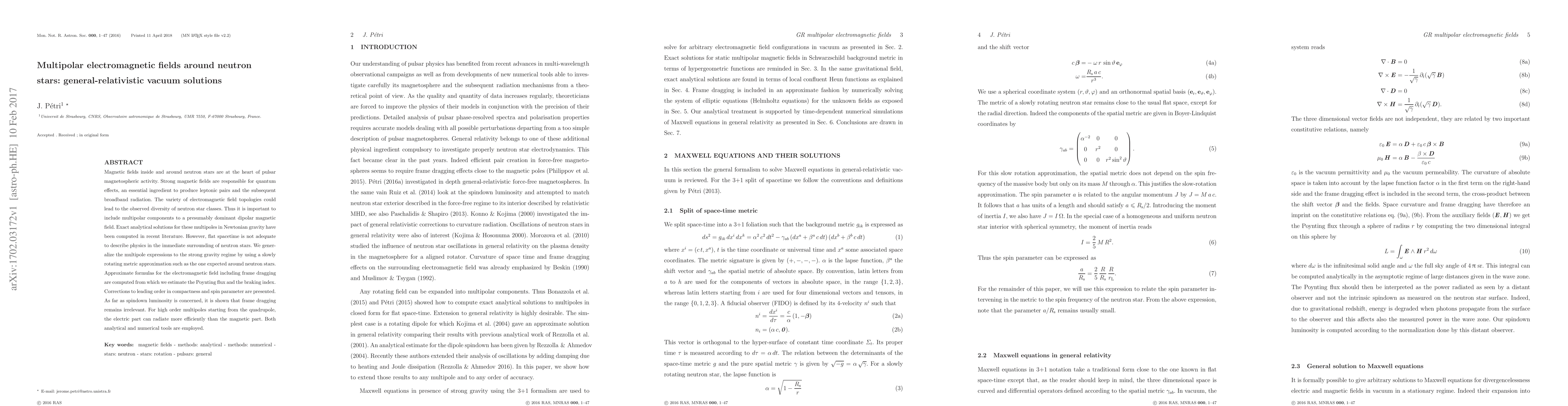 This paper explores multipolar electromagnetic fields around neutron stars in general relativity, providing approximate solutions for the electromagnetic field including frame dragging effects. It estimates the Poynting flux and braking index, showing that frame dragging is irrelevant for spindown luminosity but can enhance the efficiency of higher-order multipole electric fields.