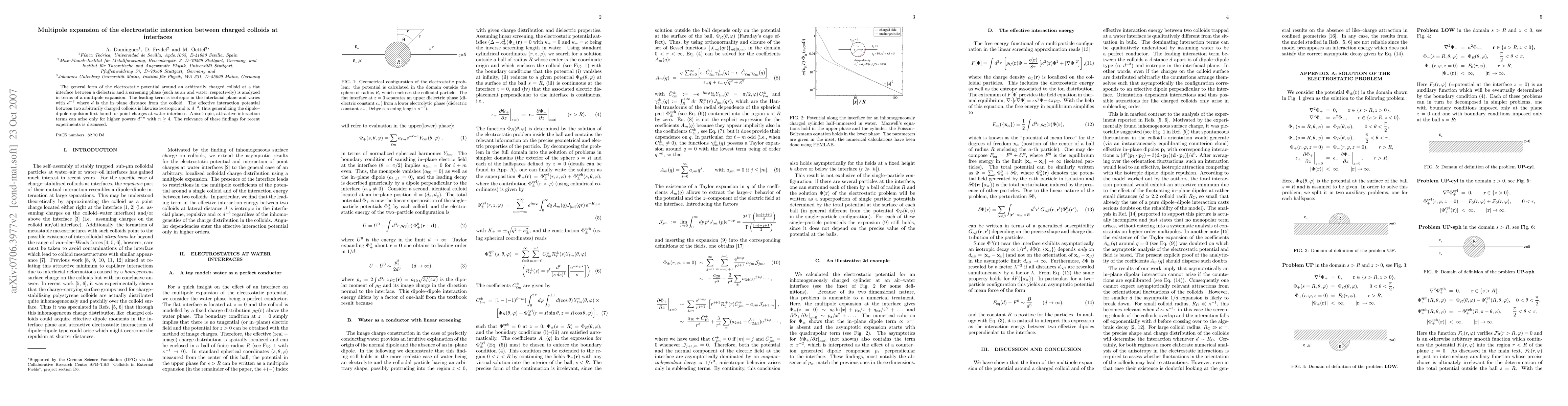 Summary: This paper analyzes the electrostatic potential around charged colloids at interfaces using multipole expansion, finding that the leading term is isotropic and varies as $d^{-3}$. The interaction potential between two colloids follows a dipole-dipole interaction $\propto d^{-3}$, with higher-order anisotropic terms emerging for $d^{-n}$ with $n \ge 4$.