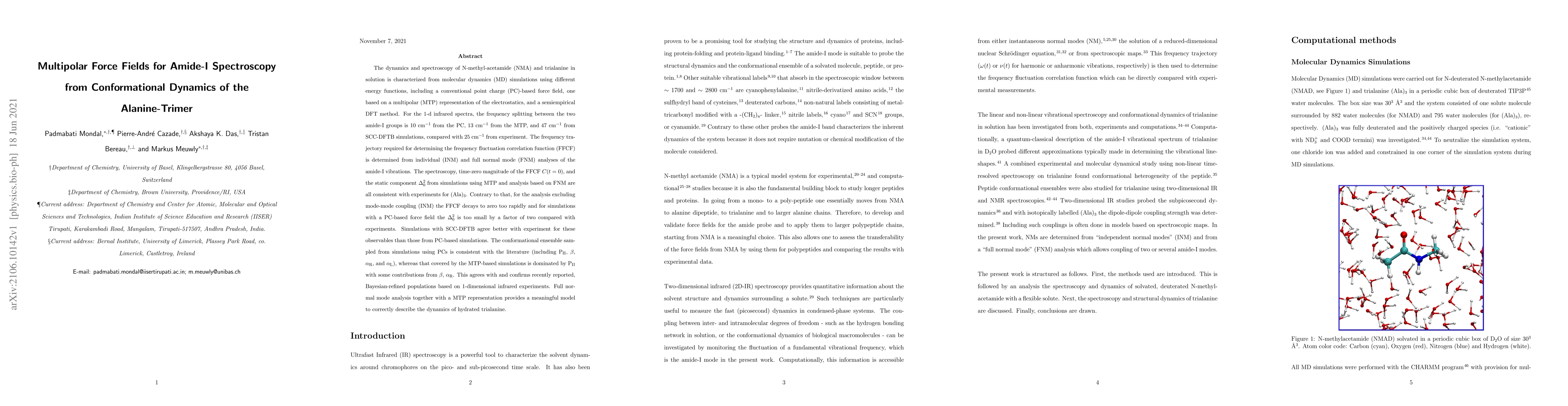 The dynamics and spectroscopy of N-methyl-acetamide (NMA) and trialanine in solution is characterized from molecular dynamics (MD) simulations using different energy functions, including a conventional point charge (PC)-based force field, one based on a multipolar (MTP) representation of the electrostatics, and a semiempirical DFT method. For the 1-d infrared spectra, the frequency splitting between the two amide-I groups is 10 cm$^{-1}$ from the PC, 13 cm$^{-1}$ from the MTP, and 47 cm$^{-1}$ from SCC-DFTB simulations, compared with 25 cm$^{-1}$ from experiment. The frequency trajectory required for determining the frequency fluctuation correlation function (FFCF) is determined from individual (INM) and full normal mode (FNM) analyses of the amide-I vibrations. The spectroscopy, time-zero magnitude of the FFCF $C(t=0)$, and the static component $\Delta_0^2$ from simulations using MTP and analysis based on FNM are all consistent with experiments for (Ala)$_3$. Contrary to that, for the analysis excluding mode-mode coupling (INM) the FFCF decays to zero too rapidly and for simulations with a PC-based force field the $\Delta_0^2$ is too small by a factor of two compared with experiments. Simulations with SCC-DFTB agree better with experiment for these observables than those from PC-based simulations. The conformational ensemble sampled from simulations using PCs is consistent with the literature , whereas that covered by the MTP-based simulations is dominated by P$_{\rm II}$ which agrees with and confirms recently reported, Bayesian-refined populations based on 1-dimensional infrared experiments. Full normal mode analysis together with a MTP representation provides a meaningful model to correctly describe the dynamics of hydrated trialanine.