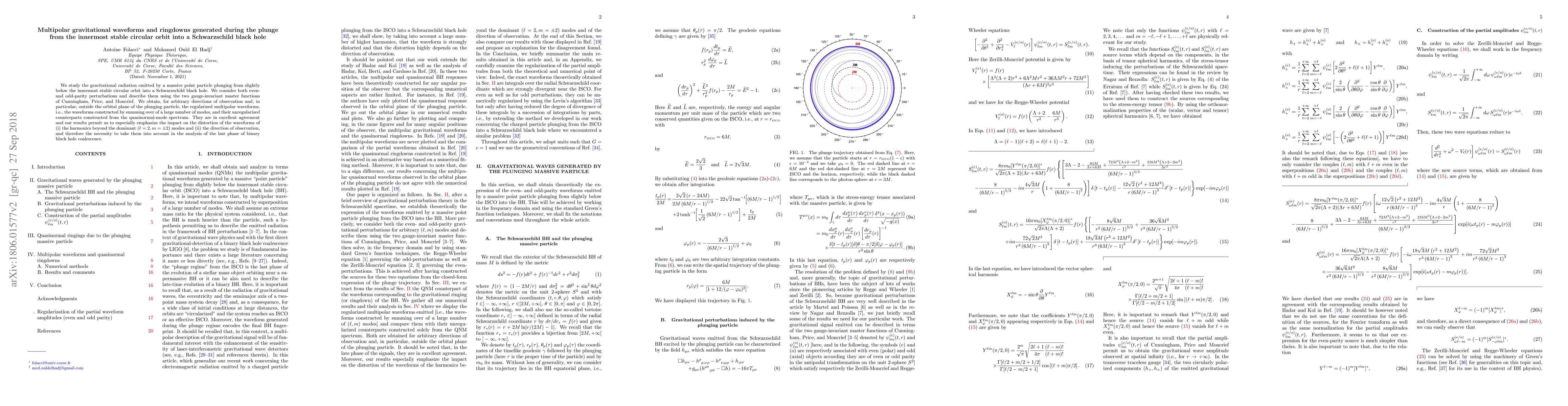 This paper investigates gravitational radiation from a massive particle plunging into a Schwarzschild black hole, focusing on multipolar waveforms and ringdowns. It provides detailed waveforms considering higher harmonics and observation angles, emphasizing their importance for analyzing the final stages of binary black hole mergers.