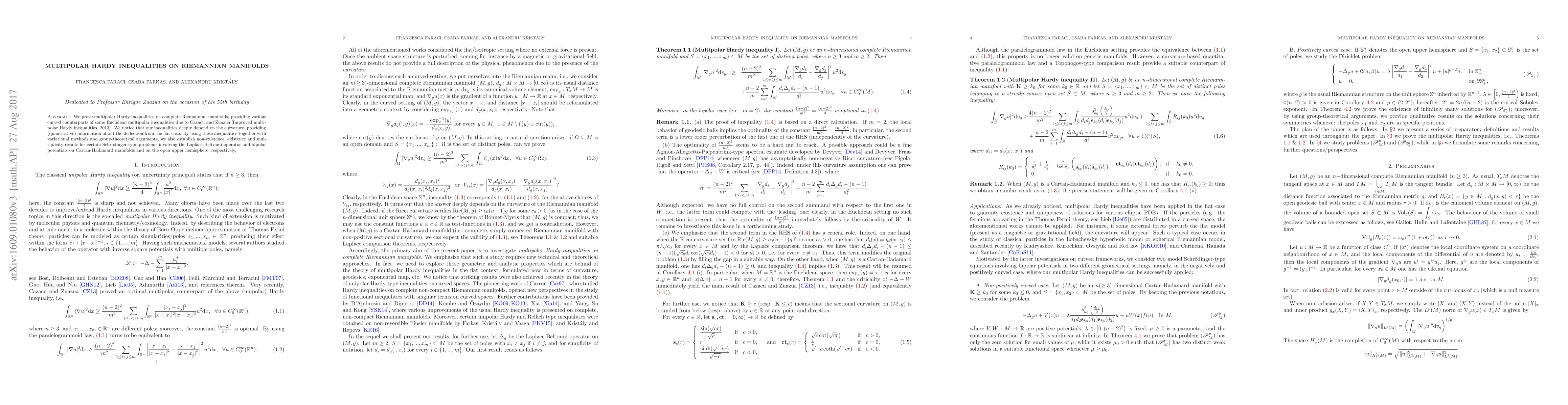 This paper proves multipolar Hardy inequalities on complete Riemannian manifolds, highlighting their dependence on curvature and providing insights into deviations from the flat Euclidean case. It also uses these inequalities to derive results on non-existence, existence, and multiplicity for Schrödinger-type problems involving the Laplace-Beltrami operator on specific manifolds.