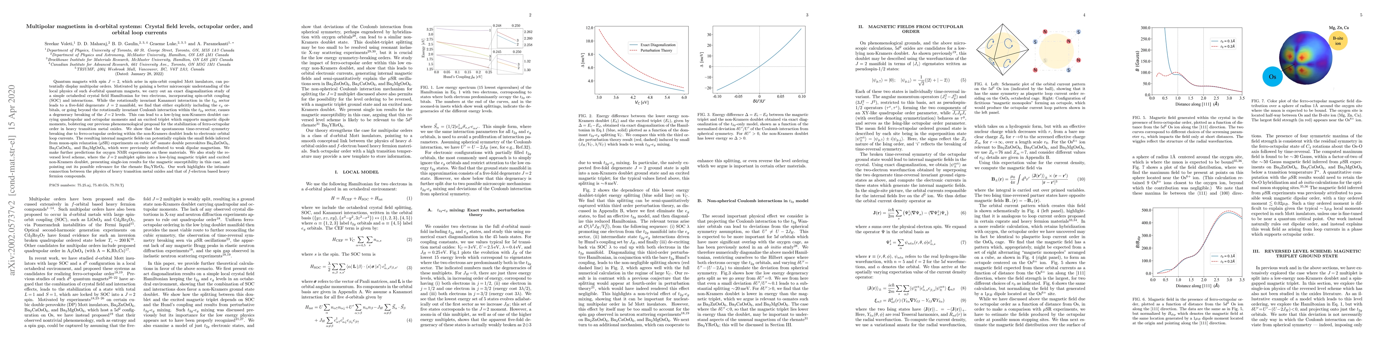 Quantum magnets with spin $J=2$, which arise in spin-orbit coupled Mott insulators, can potentially display multipolar orders. We carry out an exact diagonalization study of a simple octahedral crystal field Hamiltonian for two electrons, incorporating spin-orbit coupling (SOC) and interactions, finding that either explicitly including the $e_g$ orbitals, or going beyond the rotationally invariant Coulomb interaction within the $t_{2g}$ sector, causes a degeneracy breaking of the $J\!=\!2$ level degeneracy. This can lead to a low-lying non-Kramers doublet carrying quadrupolar and octupolar moments and an excited triplet which supports magnetic dipole moments, bolstering our previous phenomenological proposal for the stabilization of ferro-octupolar order in heavy transition metal oxides. We show that the spontaneous time-reversal symmetry breaking due to ferro-octupolar ordering within the non-Kramers doublet leads to electronic orbital loop currents. The resulting internal magnetic fields can potentially explain the small fields inferred from muon-spin relaxation ($\mu$SR) experiments on cubic $5d^2$ osmate double perovskites Ba$_2$ZnOsO$_6$, Ba$_2$CaOsO$_6$, and Ba$_2$MgOsO$_6$, which were previously attributed to weak dipolar magnetism. We make further predictions for oxygen NMR experiments on these materials. We also study the reversed level scheme, where the $J\!=\!2$ multiplet splits into a low-lying magnetic triplet and excited non-Kramers doublet, presenting single-ion results for the magnetic susceptibility in this case, and pointing out its possible relevance for the rhenate Ba$_2$YReO$_6$. Our work highlights the intimate connection between the physics of heavy transition metal oxides and that of $f$-electron based heavy fermion compounds.