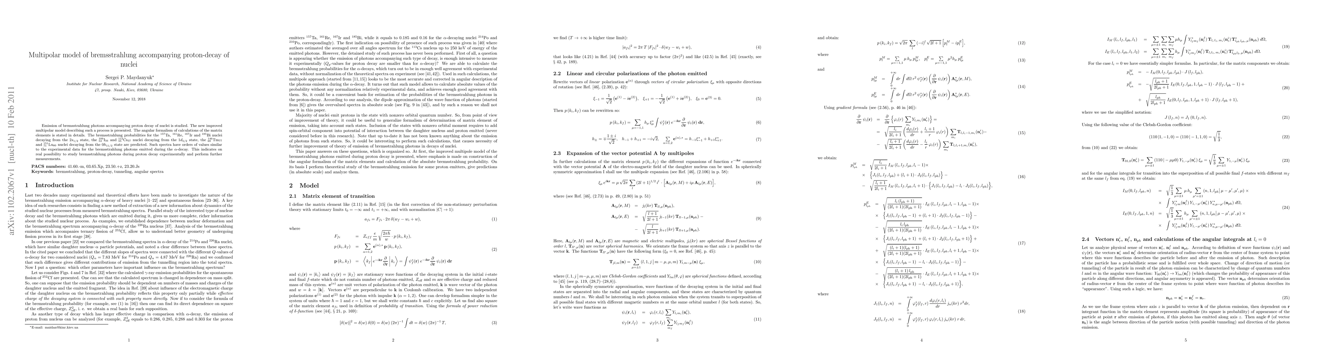 Emission of bremsstrahlung photons accompanying proton decay of nuclei is studied. The new improved multipolar model describing such a process is presented. The angular formalism of calculations of the matrix elements is stated in details. The bremsstrahlung probabilities for the $^{157}{\rm Ta}$, $^{161}{\rm Re}$, $^{167}{\rm Ir}$ and $^{185}{\rm Bi}$ nuclei decaying from the $2s_{1/2}$ state, the $^{109}_{53}{\rm I}_{56}$ and $^{112}_{55}{\rm Cs}_{57}$ nuclei decaying from the $1d_{5/2}$ state, the $^{146}_{69}{\rm Tm}_{77}$ and $^{151}_{71}{\rm Lu}_{80}$ nuclei decaying from the $0h_{11/2}$ state are predicted. Such spectra have orders of values similar to the experimental data for the bremsstrahlung photons emitted during the $\alpha$-decay. This indicates on real possibility to study bremsstrahlung photons during proton decay experimentally and perform further measurements.