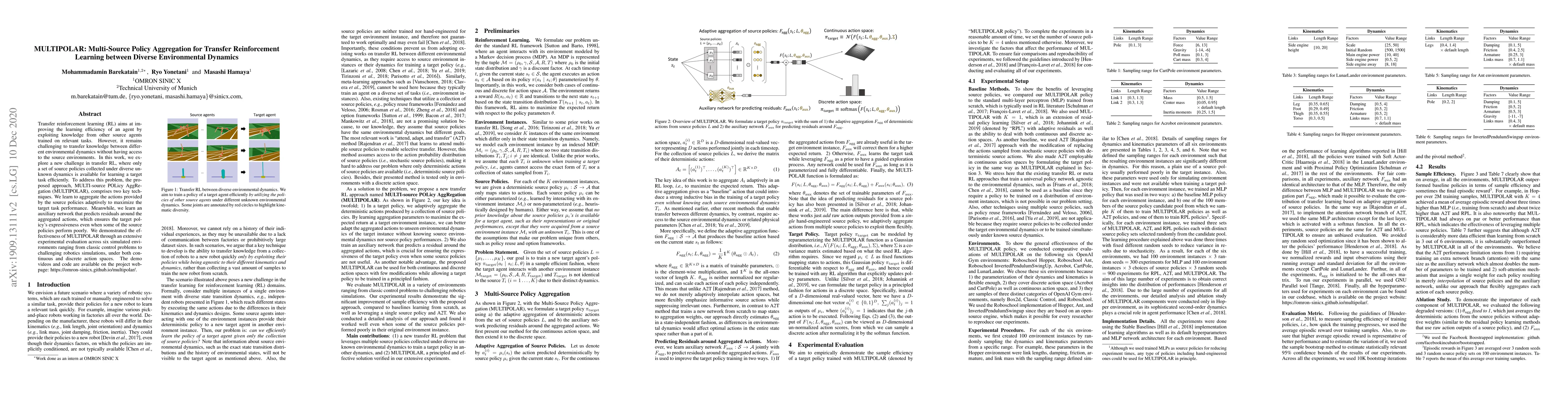 MULTIPOLAR is a method for transfer reinforcement learning that aggregates policies from diverse unknown source environments to efficiently learn a target task. It adaptively combines source actions and predicts residuals for expressive target policy, validated across six varied environments.