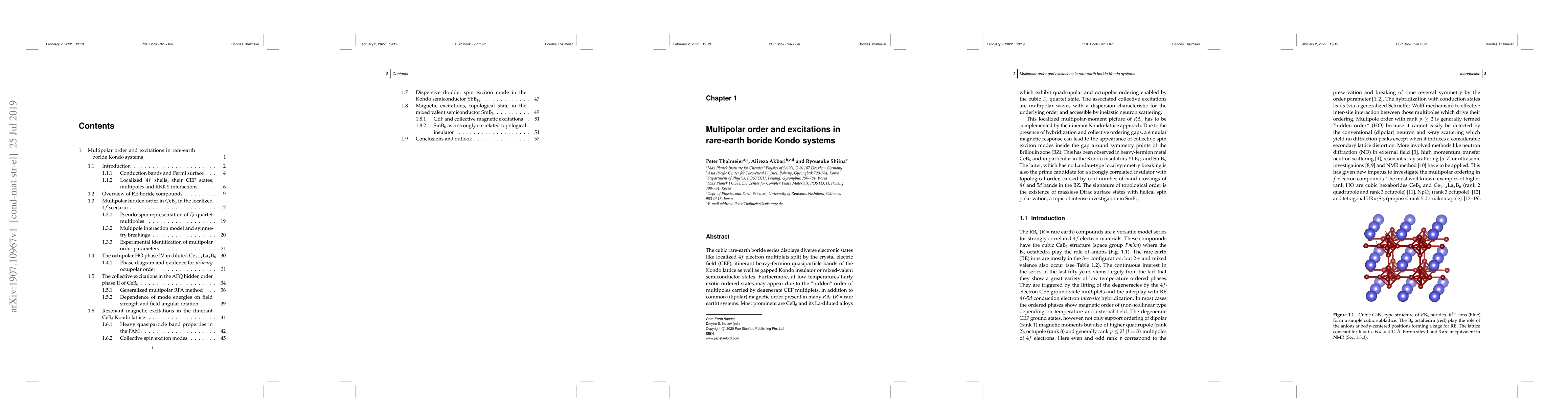 We review the cubic rare-earth boride series which displays diverse electronic states like localized 4f electron multiplets split by the crystal electric field (CEF), itinerant heavy-fermion quasiparticle bands of the Kondo lattice as well as gapped Kondo insulator or mixed-valent semiconductor states. Fairly exotic states may appear due to the 'hidden' order of multipoles carried by degenerate CEF multiplets, in addition to magnetic order present in many RB6 (R = rare earth) compounds. Most prominent are CeB6 and its La-diluted alloys which exhibit antiferro-quadrupolar and octupolar ordering enabled by the cubic G8 quartet state. The associated collective excitations are multipolar waves with a dispersion characteristic for the underlying order and accessible by inelastic neutron scattering. This localized multipolar-moment picture of R-borides is complemented by the itinerant Kondo-lattice approach. Collective spin exciton modes inside the hybridization gap around symmetry points of the Brillouin zone may appear. This has been observed in heavy-fermion metal CeB6 and in particular in the Kondo insulators YbB12 and SmB6. The latter is also the prime candidate for a strongly correlated topological insulator.