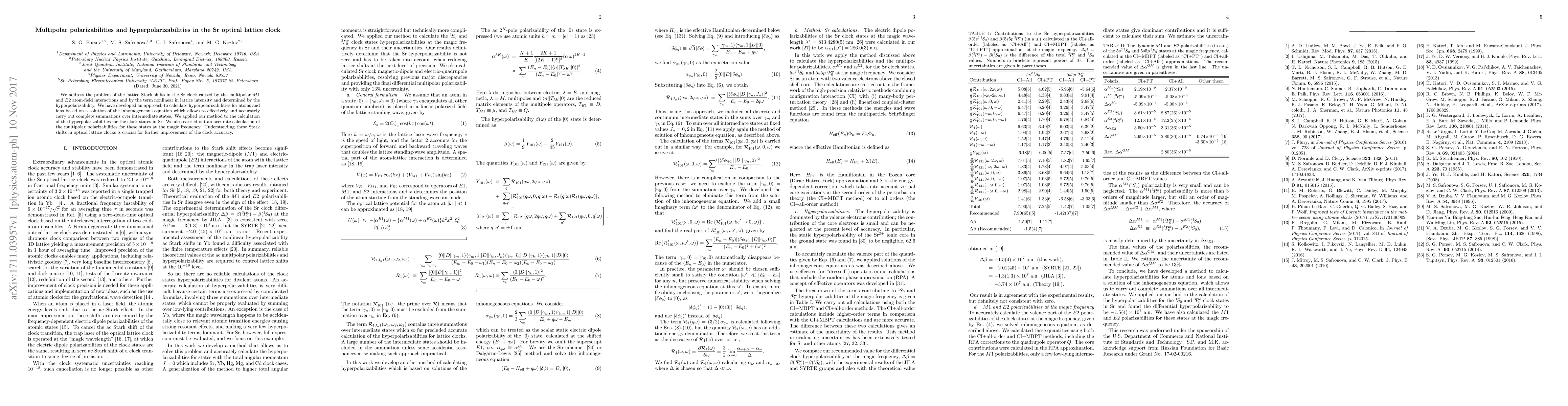 We address the problem of the lattice Stark shifts in the Sr clock caused by the multipolar $M1$ and $E2$ atom-field interactions and by the term nonlinear in lattice intensity and determined by the hyperpolarizability. We have developed an approach to calculate hyperpolarizabilities for atoms and ions based on a solution of the inhomogeneous equation which allows to effectively and accurately carry out complete summations over intermediate states. We applied our method to the calculation of the hyperpolarizabilities for the clock states in Sr. We also carried out an accurate calculation of the multipolar polarizabilities for these states at the magic frequency. Understanding these Stark shifts in optical lattice clocks is crucial for further improvement of the clock accuracy.