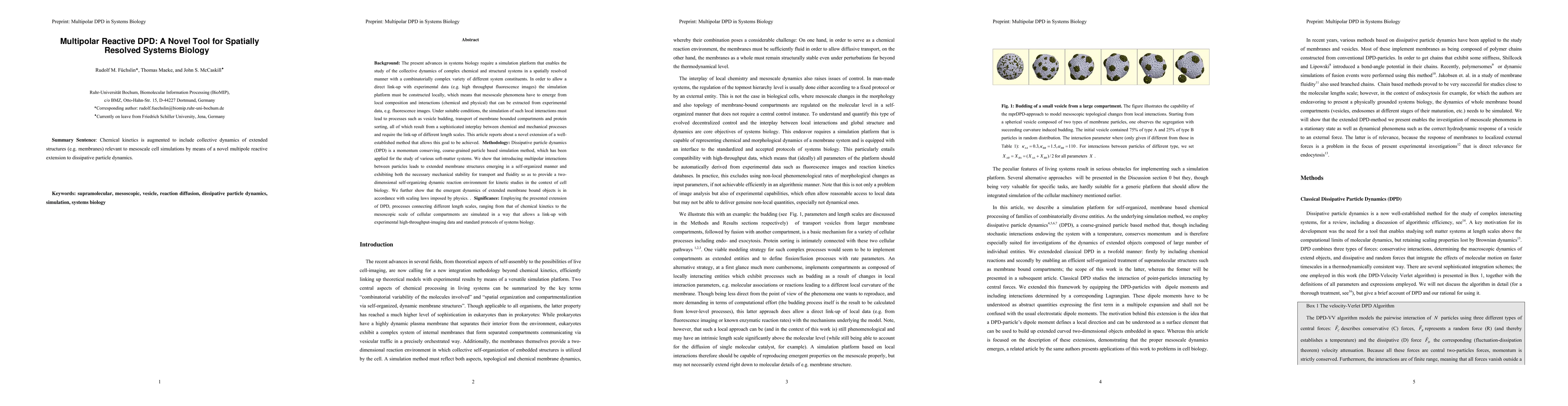 This article reports about a novel extension of dissipative particle dynamics (DPD) that allows the study of the collective dynamics of complex chemical and structural systems in a spatially resolved manner with a combinatorially complex variety of different system constituents. We show that introducing multipolar interactions between particles leads to extended membrane structures emerging in a self-organized manner and exhibiting both the necessary mechanical stability for transport and fluidity so as to provide a two-dimensional self-organizing dynamic reaction environment for kinetic studies in the context of cell biology. We further show that the emergent dynamics of extended membrane bound objects is in accordance with scaling laws imposed by physics.