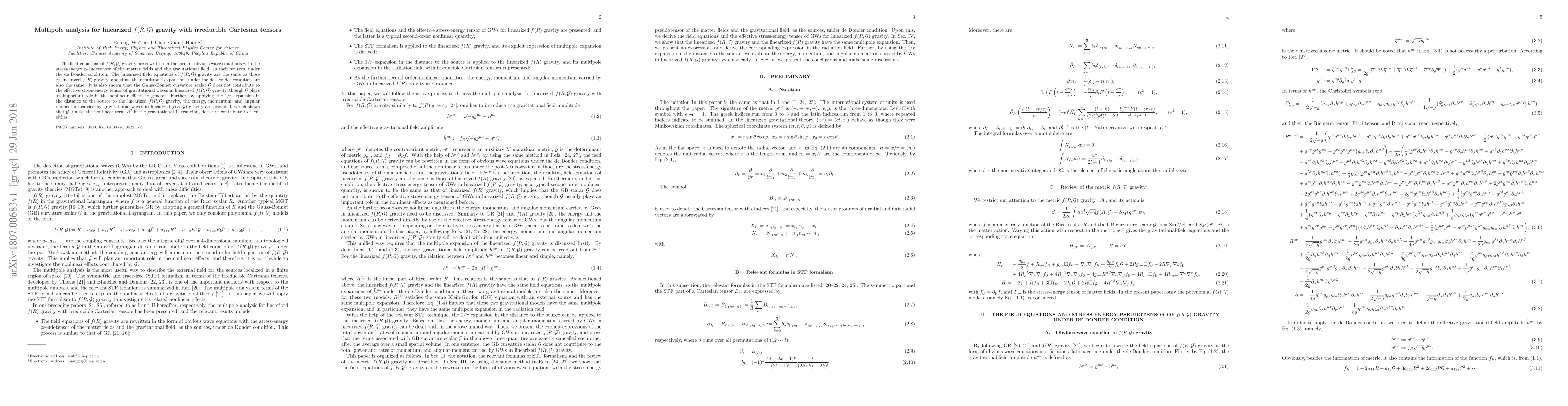 The field equations of $f(R,\mathcal{G})$ gravity are rewritten in the form of obvious wave equations with the stress-energy pseudotensor of the matter fields and the gravitational field, as their sources, under the de Donder condition. The linearized field equations of $f(R,\mathcal{G})$ gravity are the same as those of linearized $f(R)$ gravity, and thus, their multipole expansions under the de Donder condition are also the same. It is also shown that the Gauss-Bonnet curvature scalar $\mathcal{G}$ does not contribute to the effective stress-energy tensor of gravitational waves in linearized $f(R,\mathcal{G})$ gravity, though $\mathcal{G}$ plays an important role in the nonlinear effects in general. Further, by applying the $1/r$ expansion in the distance to the source to the linearized $f(R,\mathcal{G})$ gravity, the energy, momentum, and angular momentum carried by gravitational waves in linearized $f(R,\mathcal{G})$ gravity are provided, which shows that $\mathcal{G}$, unlike the nonlinear term $R^2$ in the gravitational Lagrangian, does not contribute to them either.