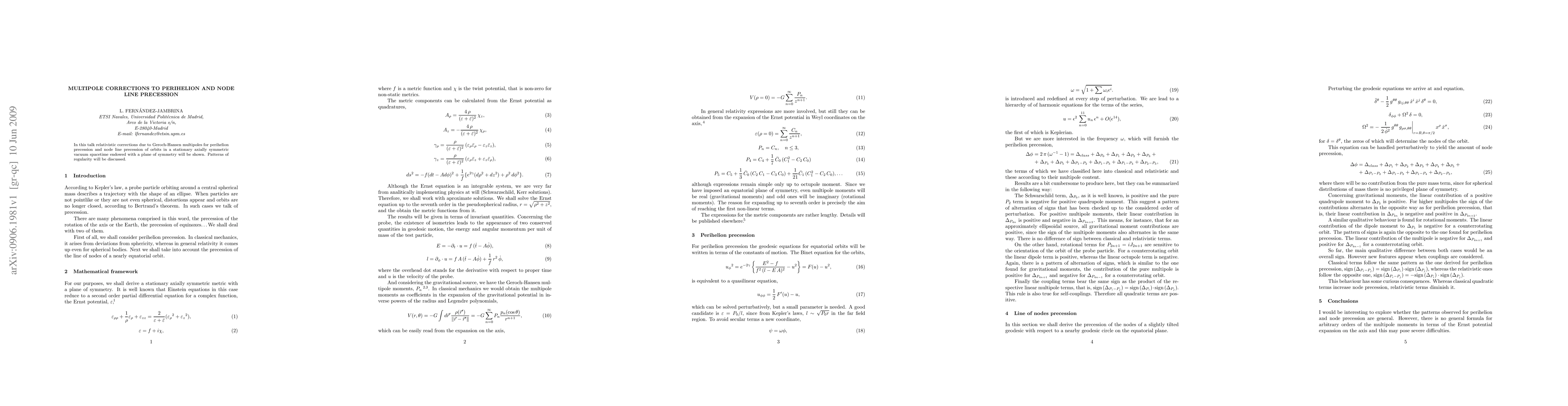 This paper discusses relativistic corrections to perihelion and node line precession in stationary axially symmetric vacuum spacetimes, focusing on the effects of Geroch-Hansen multipole moments and the regularity patterns observed.