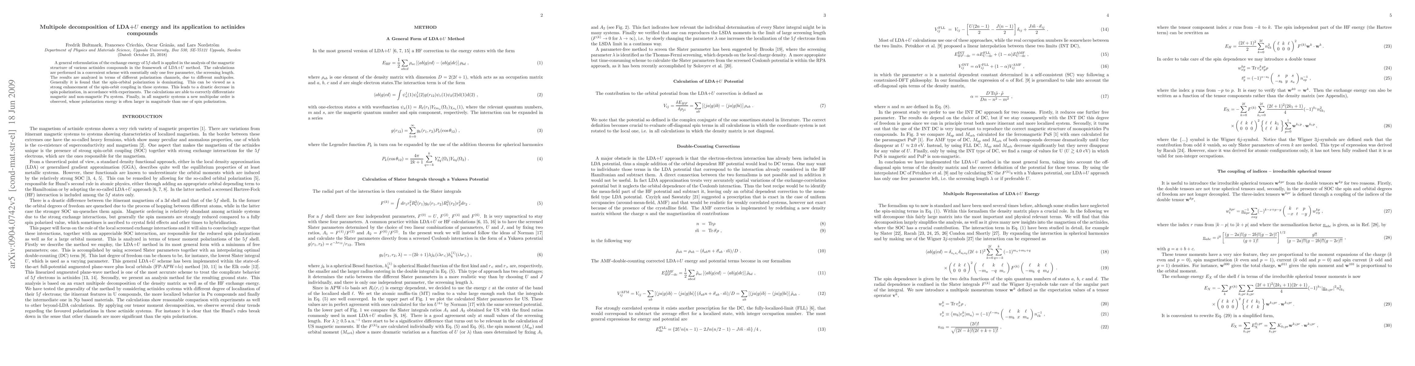 A general reformulation of the exchange energy of $5f$-shell is applied in the analysis of the magnetic structure of various actinides compounds in the framework of LDA+U method. The calculations are performed in an efficient scheme with essentially only one free parameter, the screening length. The results are analysed in terms of different polarisation channels, due to different multipoles. Generally it is found that the spin-orbital polarisation is dominating. This can be viewed as a strong enhancement of the spin-orbit coupling in these systems. This leads to a drastic decrease in spin polarisation, in accordance with experiments. The calculations are able to correctly differentiate magnetic and non-magnetic Pu system. Finally, in all magnetic systems a new multipolar order is observed, whose polarisation energy is often larger in magnitude than that of spin polarisation.