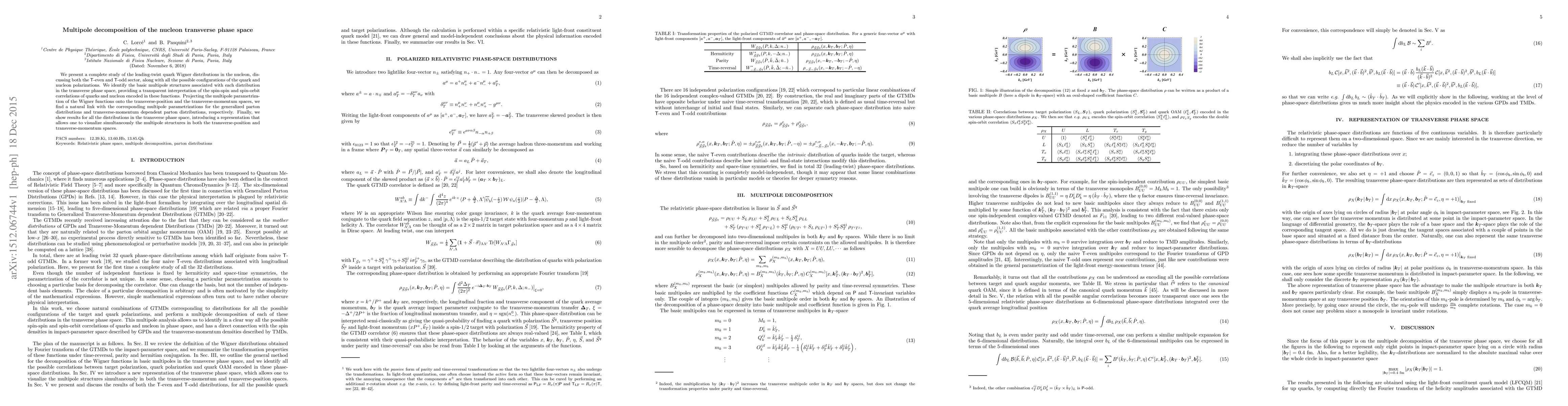We present a complete study of the leading-twist quark Wigner distributions in the nucleon, discussing both the $\mathsf T$-even and $\mathsf T$-odd sector, along with all the possible configurations of the quark and nucleon polarizations. We identify the basic multipole structures associated with each distribution in the transverse phase space, providing a transparent interpretation of the spin-spin and spin-orbit correlations of quarks and nucleon encoded in these functions. Projecting the multipole parametrization of the Wigner functions onto the transverse-position and the transverse-momentum spaces, we find a natural link with the corresponding multipole parametrizations for the generalized parton distributions and transverse-momentum dependent parton distributions, respectively. Finally, we show results for all the distributions in the transverse phase space, introducing a representation that allows one to visualize simultaneously the multipole structures in both the transverse-position and transverse-momentum spaces.