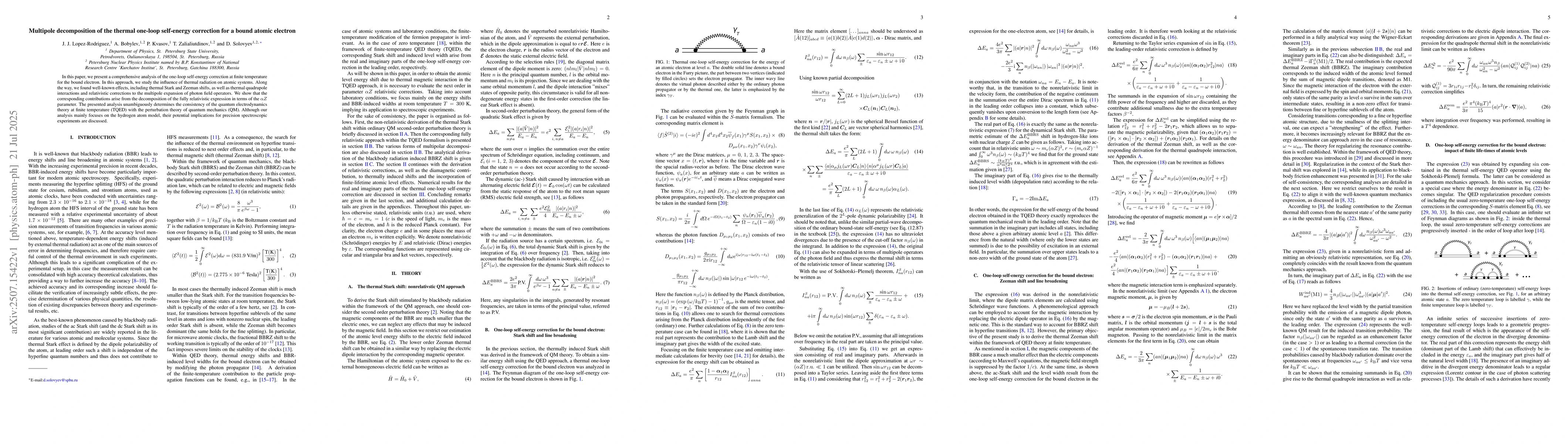 The research employs a comprehensive analysis of the one-loop self-energy correction at finite temperature for a bound atomic electron, utilizing multipole decomposition and considering thermal radiation effects, relativistic corrections, and quantum electrodynamics theory.