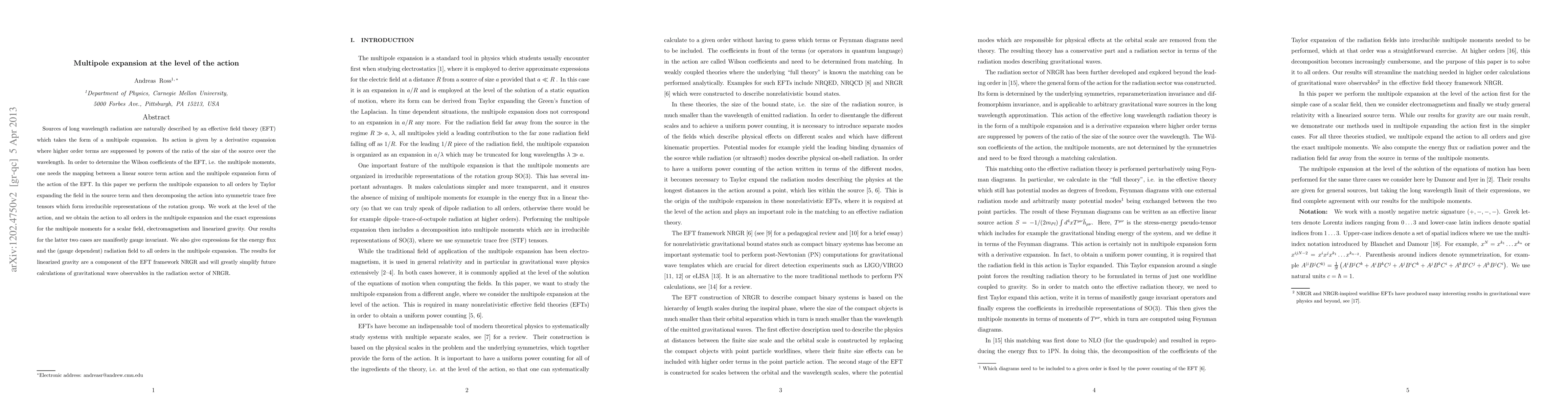 This paper develops a multipole expansion at the level of the action for effective field theories, providing exact expressions for multipole moments and related quantities for scalar fields, electromagnetism, and linearized gravity. The results simplify future gravitational wave calculations within the NRGR framework.
