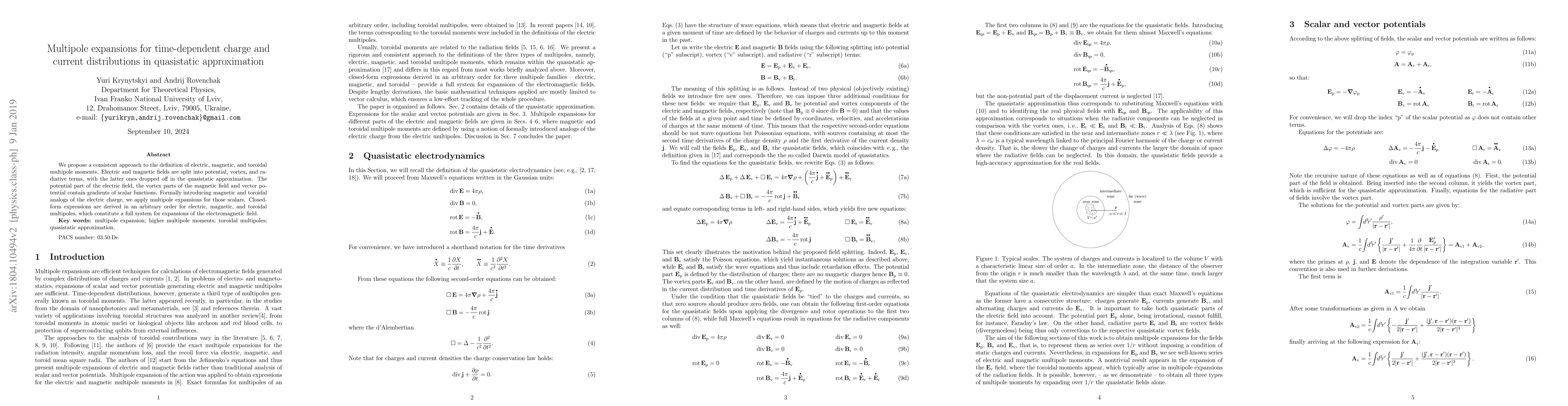 This paper proposes a method for defining electric, magnetic, and toroidal multipole moments, splitting fields into potential, vortex, and radiative terms, and applying multipole expansions to the potential and vortex parts in quasistatic approximation. Closed-form expressions for these multipoles are derived for arbitrary order.