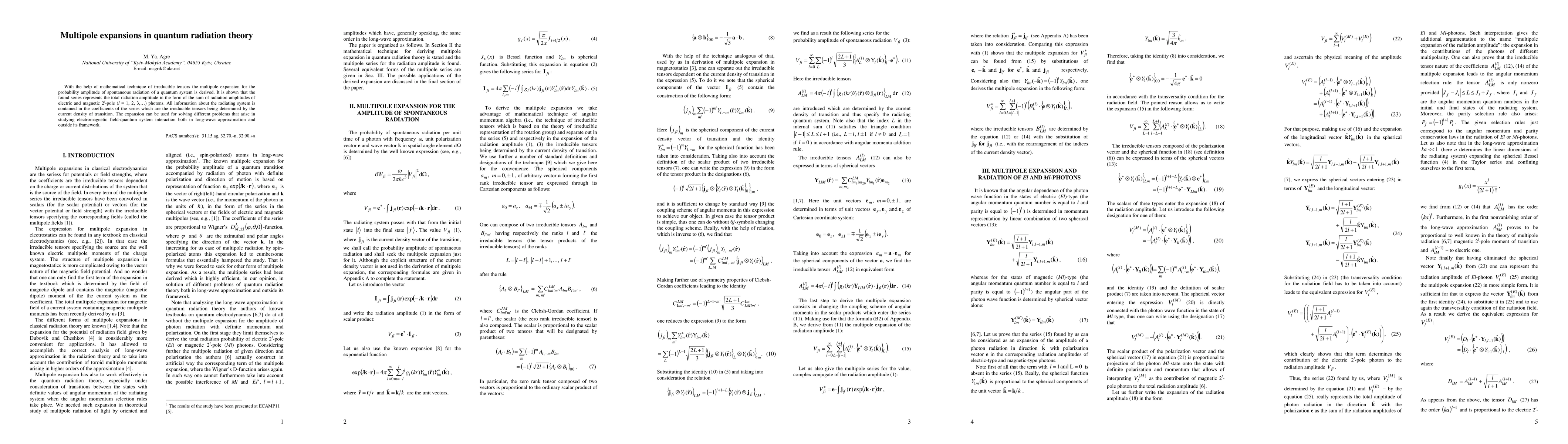 This paper derives a multipole expansion for the probability amplitude of spontaneous radiation in quantum systems using irreducible tensors, revealing the total radiation amplitude as a sum of electric and magnetic multipole photon amplitudes. The coefficients of the series, determined by the transition current density, encapsulate all information about the radiating system.