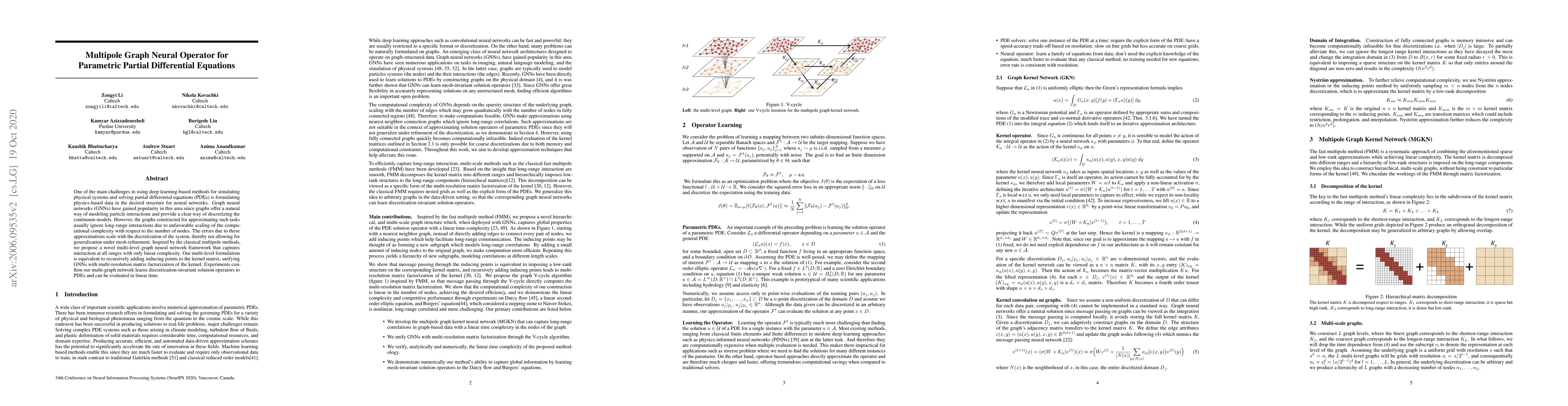 This paper proposes a multipole graph neural operator framework to solve parametric partial differential equations (PDEs) by capturing long-range interactions efficiently. The method introduces a multi-level graph neural network that generalizes under mesh refinement, achieving linear complexity and discretization-invariant solutions.