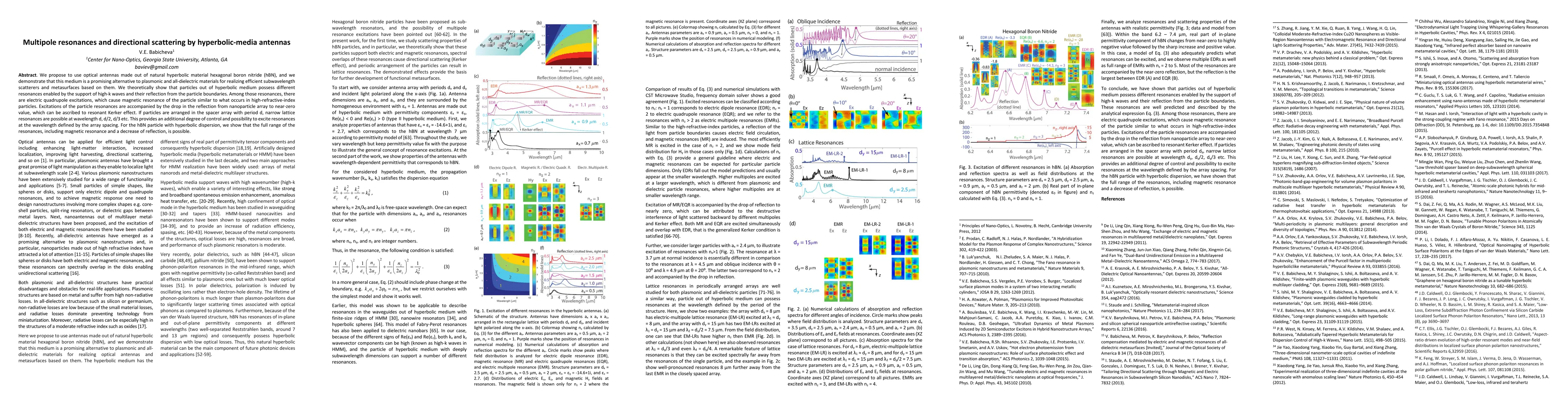 We propose to use optical antennas made out of natural hyperbolic material hexagonal boron nitride (hBN), and we demonstrate that this medium is a promising alternative to plasmonic and all-dielectric materials for realizing efficient subwavelength scatterers and metasurfaces based on them. We theoretically show that particles out of hyperbolic medium possess different resonances enabled by the support of high-k waves and their reflection from the particle boundaries. Among those resonances, there are electric quadrupole excitations, which cause magnetic resonance of the particle similar to what occurs in high-refractive-index particles. Excitations of the particle resonances are accompanied by the drop in the reflection from nanoparticle array to near-zero value, which can be ascribed to resonant Kerker effect. If particles are arranged in the spacer array with period d, narrow lattice resonances are possible at wavelength d, d/2, d/3 etc. This provides an additional degree of control and possibility to excite resonances at the wavelength defined by the array spacing. For the hBN particle with hyperbolic dispersion, we show that the full range of the resonances, including magnetic resonance and a decrease of reflection, is possible.