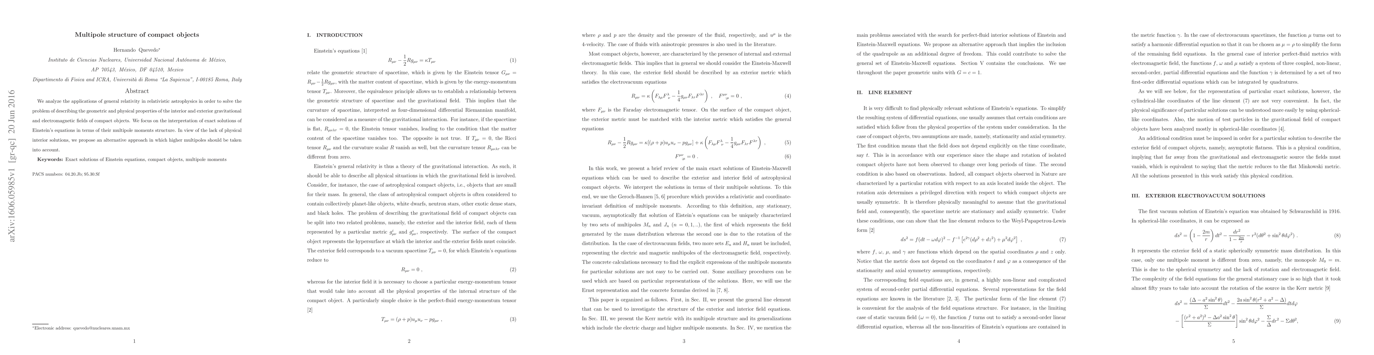 We analyze the applications of general relativity in relativistic astrophysics in order to solve the problem of describing the geometric and physical properties of the interior and exterior gravitational and electromagnetic fields of compact objects. We focus on the interpretation of exact solutions of Einstein's equations in terms of their multipole moments structure. In view of the lack of physical interior solutions, we propose an alternative approach in which higher multipoles should be taken into account.