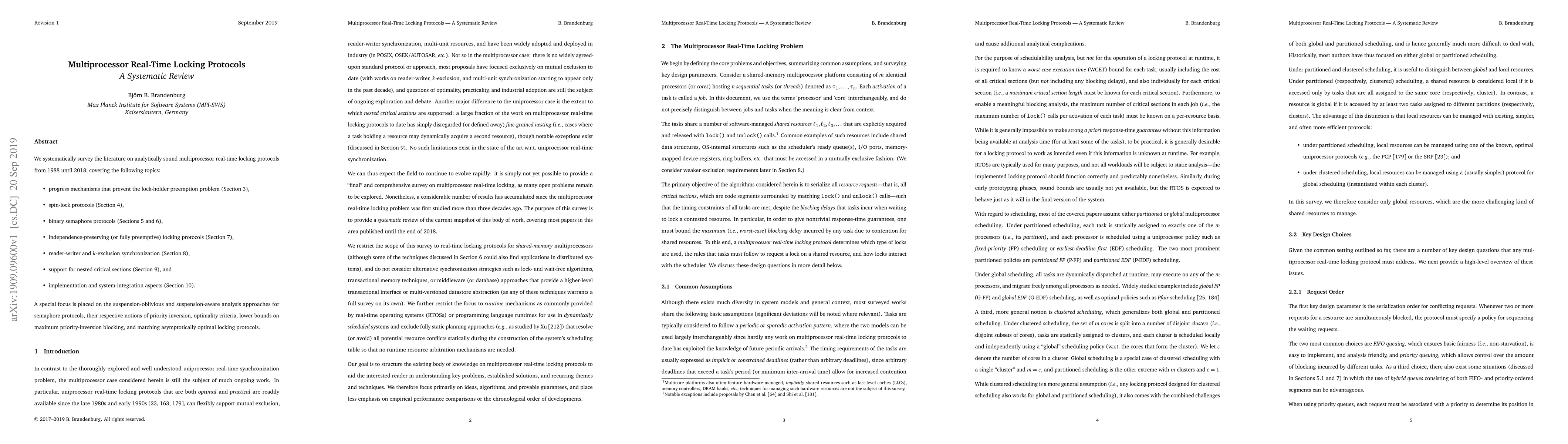 We systematically survey the literature on analytically sound multiprocessor real-time locking protocols from 1988 until 2018, covering the following topics: progress mechanisms that prevent the lock-holder preemption problem, spin-lock protocols, binary semaphore protocols, independence-preserving (or fully preemptive) locking protocols, reader-writer and k-exclusion synchronization, support for nested critical sections, and implementation and system-integration aspects. A special focus is placed on the suspension-oblivious and suspension-aware analysis approaches for semaphore protocols, their respective notions of priority inversion, optimality criteria, lower bounds on maximum priority-inversion blocking, and matching asymptotically optimal locking protocols.