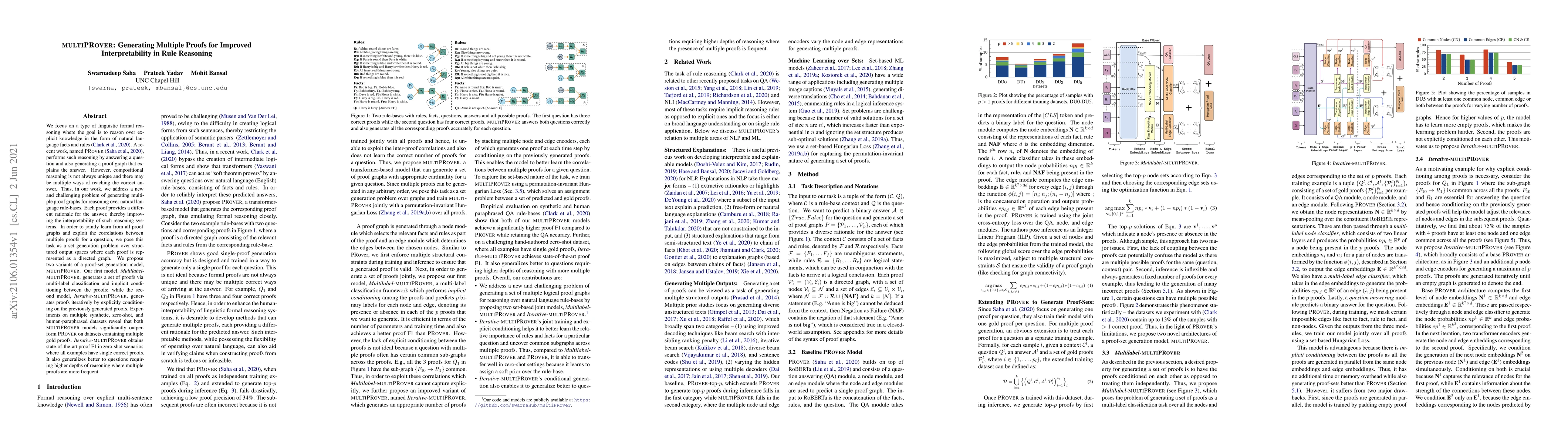 The paper introduces multiPRover, a system generating multiple proof graphs to enhance interpretability in natural language rule reasoning. It proposes two models: Multilabel-multiPRover and Iterative-multiPRover, which outperform the single-proof PRover model, especially in zero-shot and complex reasoning scenarios.