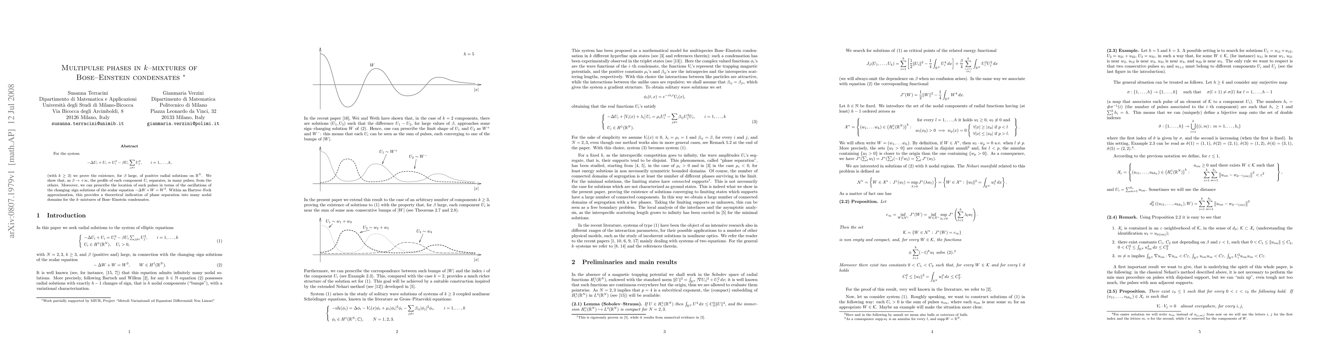 This paper proves the existence of multipulse radial solutions in k-mixtures of Bose-Einstein condensates under large competition parameters, showing that as the competition parameter increases, the profiles of each component separate into distinct pulses. The study also indicates phase separation into many nodal domains within an Hartree-Fock approximation.